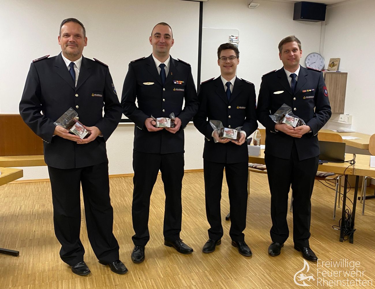 Mit gutem Beispiel voran gingen Denis Fritz, Markus Gerstner, Bernd Marggrander und Lukas Werk mit einem lückenlosen Übungsbesuch. Als Anerkennung erhielten sie den traditionellen Feuerwehr-Schinken.