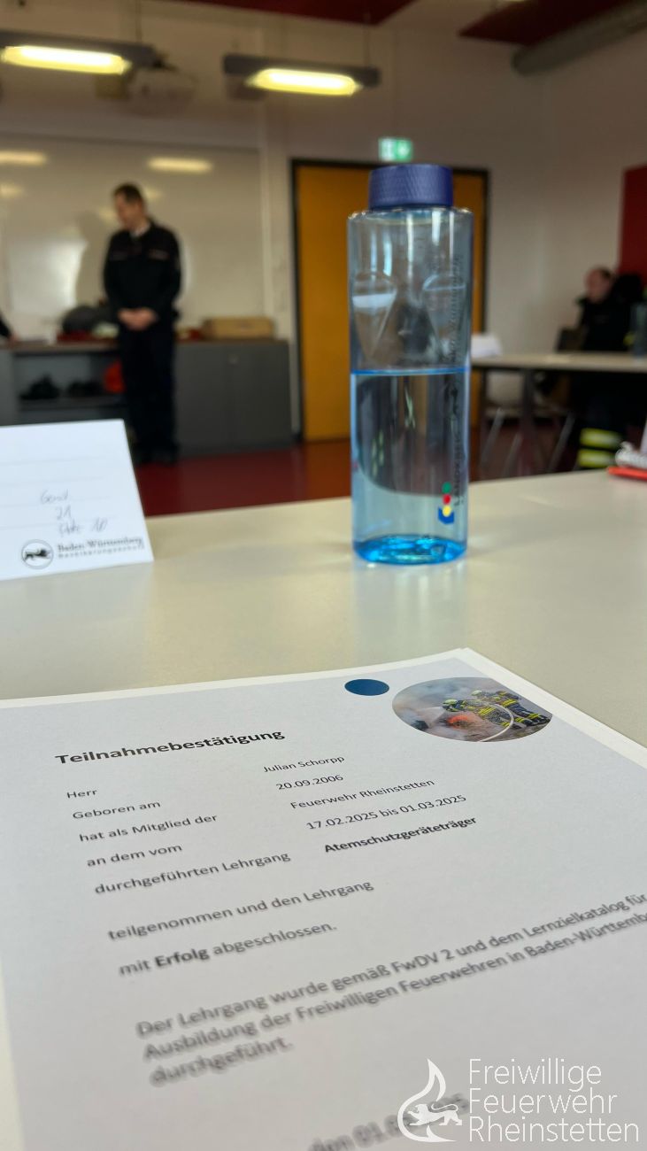 Nach der Prüfung im Brandcontainer wurden die Urkunden an alle zwölf Teilnehmenden überreicht, die mit Erfolg bestanden hatten. Um nun an den ersten Einsätzen unter Atemschutz teilnehmen zu können und Erfahrung zu sammeln, werden Arthur und Julian nach und nach auf die Atemschutzgeräte und das Equipment der Abteilung Rheinstetten unterwiesen.
