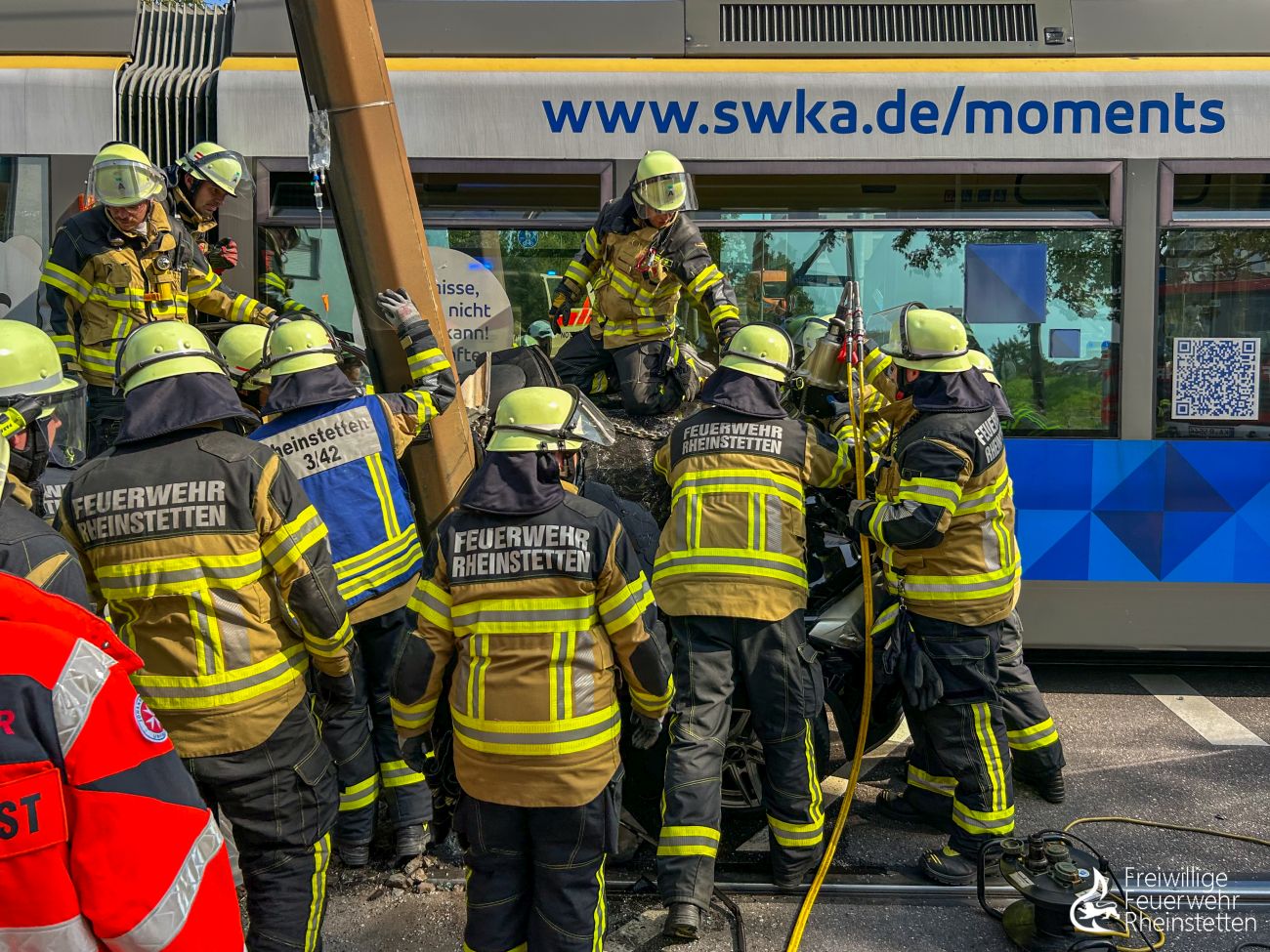 Gerade als Einsatzkräfte der Abteilung Rheinstetten zur Unterstützung bei einem Großbrand in Malsch eingetroffen waren, wurde um 15:15 Uhr ein Einsatz in der Stadtmitte gemeldet und beide Abteilungen der Feuerwehr Rheinstetten alarmiert. Ein PKW war mit einer Straßenbahn zusammengestoßen, so der Notrufinhalt. Beim Eintreffen bot sich den ersten Einsatzkräften ein dramatisches Bild - ein stark deformierter PKW war zwischen einem massiven Oberleitungsmasten und einer Straßenbahn eingeklemmt, die Beifahrerseite war bis zur Mittelkonsole eingedrückt und eine Person befand sich noch im Fahrzeug. Augenzeugen und Ersthelfer waren zwar bereits zur eingeklemmten Person vorgedrungen, konnte sie jedoch nicht befreien und betreuten sie bis zum Eintreffen der zahlreichen Einsatzkräfte. Wir berichteten HIER.