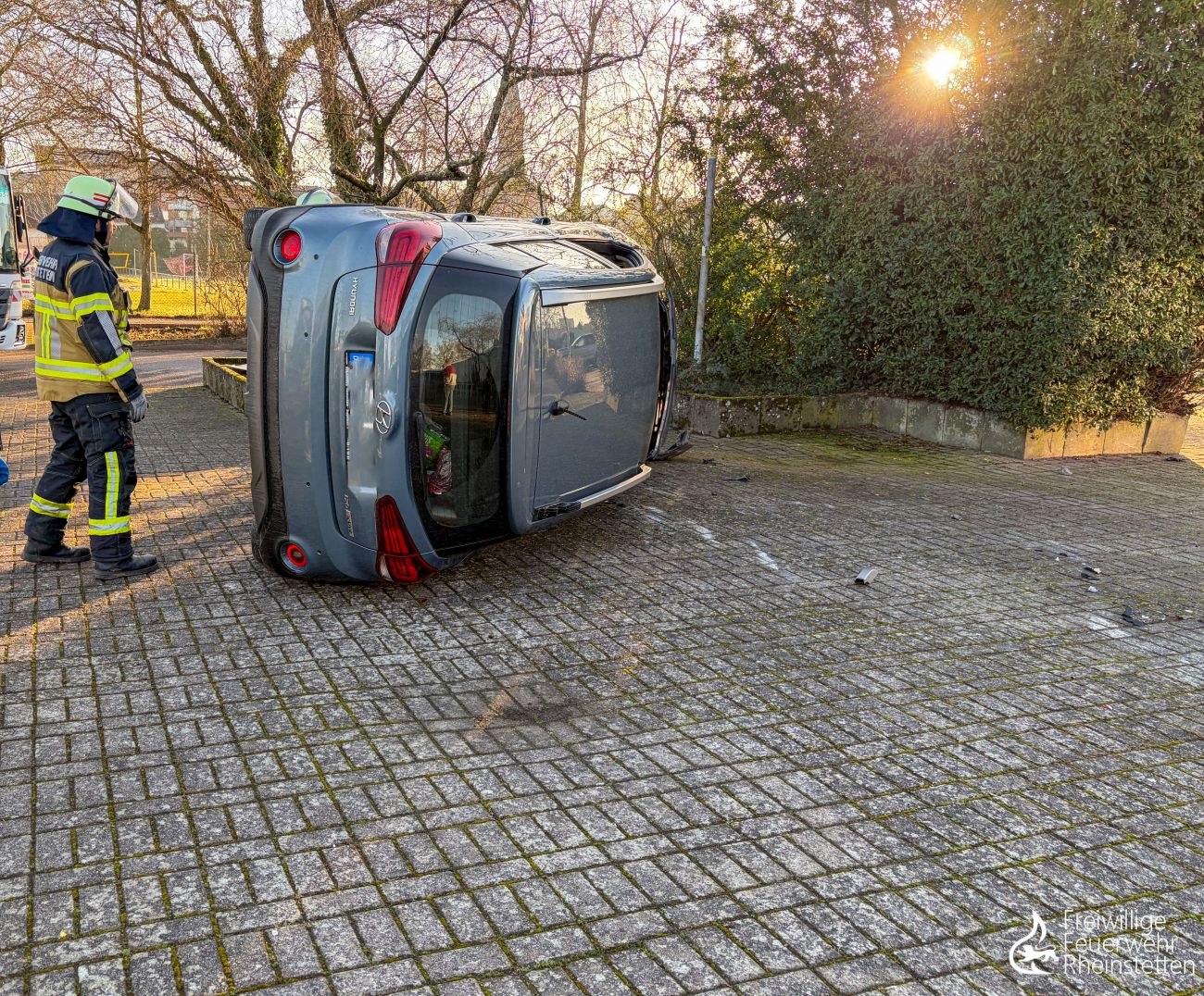 Der ersteintreffende Kommandowagen sicherte und stütze die Person im Inneren des Fahrzeug bis zum Eintreffen der zahlreichen alarmierten Einsatzkräfte. Da eine Rettung der Person über die nach oben zeigende Fahrertür nur schwer möglich gewesen wäre, wurde das Fahrzeug mit zwei Steckerleiterteilen stabilisiert und erschütterungsfrei wieder auf die Räder gedreht. Die Fahrertür konnte daraufhin geöffnet und ein Zugang für den Rettungsdienst hergestellt werden. Abschließend wurde die Batterie am Unfallfahrzeug abgeklemmt und es wurden ausgetretene Betriebsstoffe abgebunden. Die Feuerwehr Rheinstetten war mit fünf Fahrzeugen vor Ort. Ebenfalls vor Ort war der Rettungsdienst mit einem organisatorischen Leiter, zwei Rettungswagen und einem Notarztfahrzeug. Die Polizei war mit einem Streifenwagen im Einsatz.