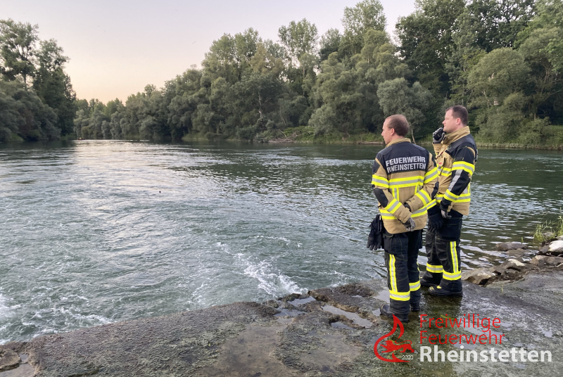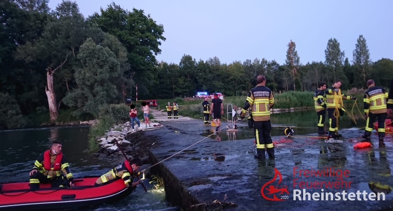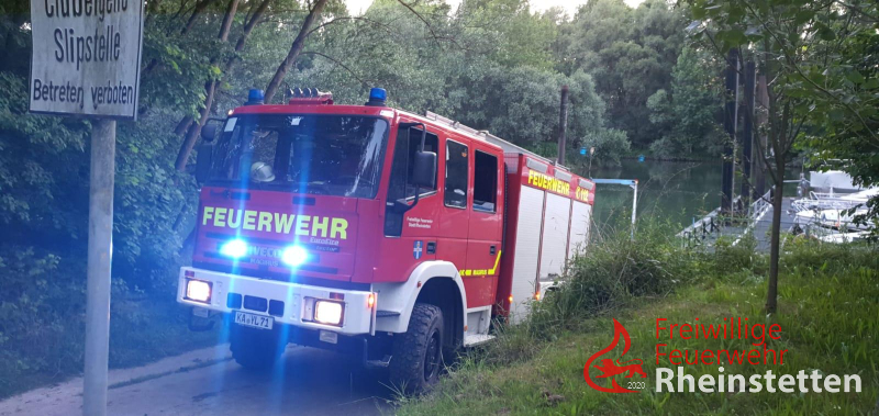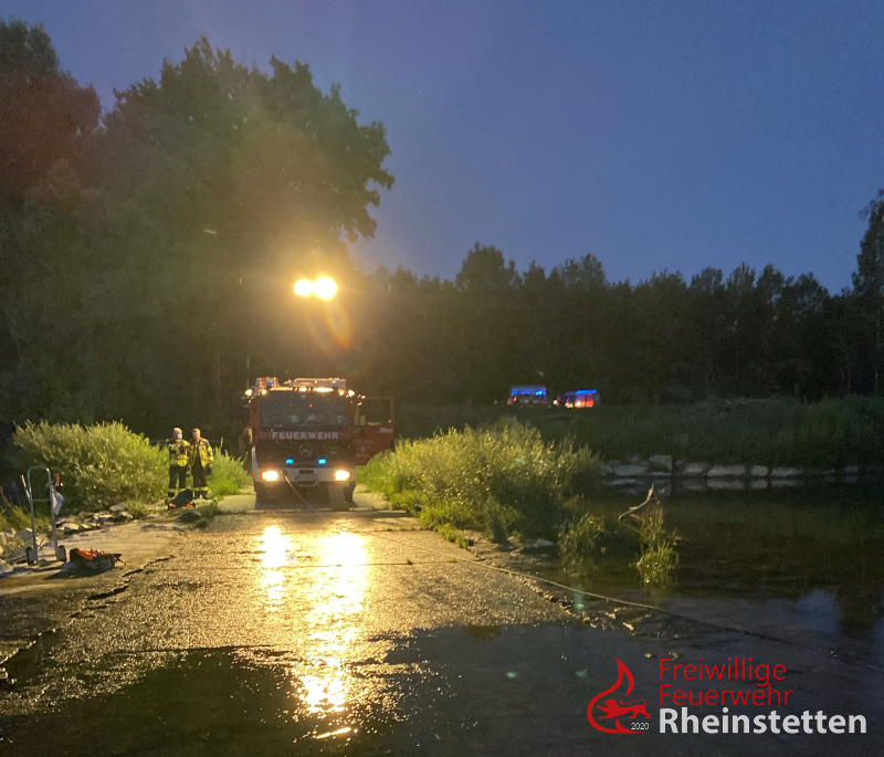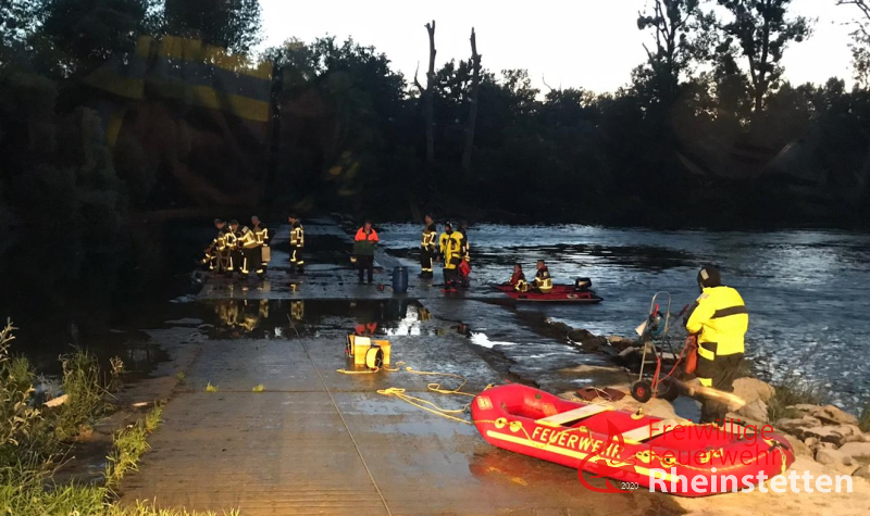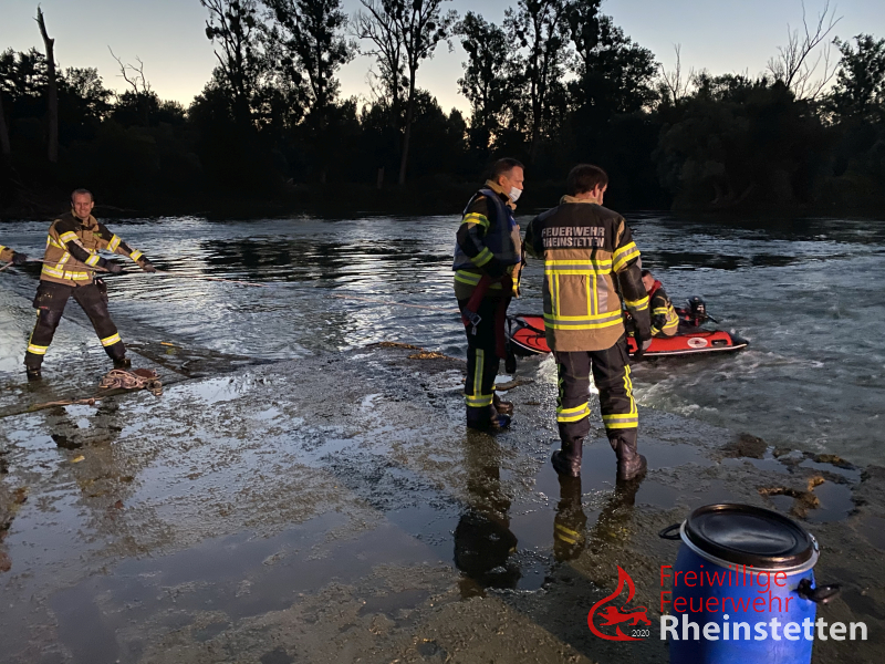Die Feuerwehr Rheinstetten ließ sofort das Mehrzweckboot an der Slippstelle beim Yachthafen Au am Rhein / Neuburgweier zu Wasser, zeitgleich wurde das Rettungsboot im Bereich der Unglücksstelle eingesetzt und die Ausläufe der Wasserdurchführungen kontrolliert. Das Mehrzweckboot fuhr den Altrhein flussaufwärts zur Unglücksstelle und suchte nach den beiden Fellnasen im Ufer und Flussbereich. Auch eine Nahbereichssuche brachte keinen Erfolg. Die Feuerwehr Au am Rhein, auf dessen Gemarkung sich die Einsatzstelle befand, wurde zwischenzeitlich zum Einsatz hinzudisponiert. Diese ging ebenfalls mit einem Boot oberhalb der Flussüberquerung zu Wasser und unterstütze zudem landseitig. Als nächstes wurde, mit einem großen Kunststofffass gesichert an Leinen, versucht, ähnlich wie beim Kaminkehren, die Durchlassröhren damit zu durchfahren um eventuelle Hindernisse in den Röhren zu lösen und so die Tiere eventuell noch retten bzw. bergen zu können. Zur Kontrolle aller Röhren musste hierfür zunächst ein großer Baum, welcher quer zur Strömung lag, mit einer Kettensäge zerkleinert und mit der Seilwinde des Rüstwagens aus dem Einlassbereich gezogen werden. Danach konnten alle Röhren mit dem Fass "kontrolliert" werden. Bei einer Röhre, gelang dies aufgrund einer Blockade nicht. Aktuell musste man, auch aufgrund der Aussagen der Besitzer davon ausgehen, dass sich genau in dieser Röhre auch die beiden Hunde befinden. Vermutlich hängen sie am Treibholz, welches sich in dieser Röhre befindet fest.