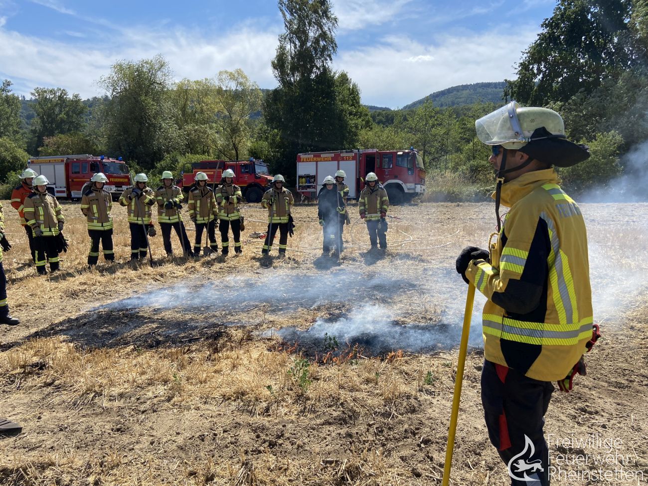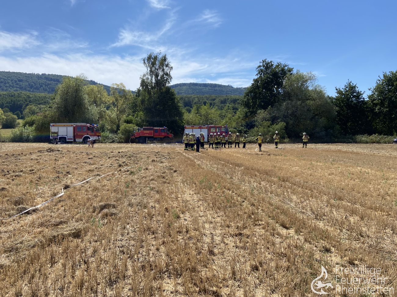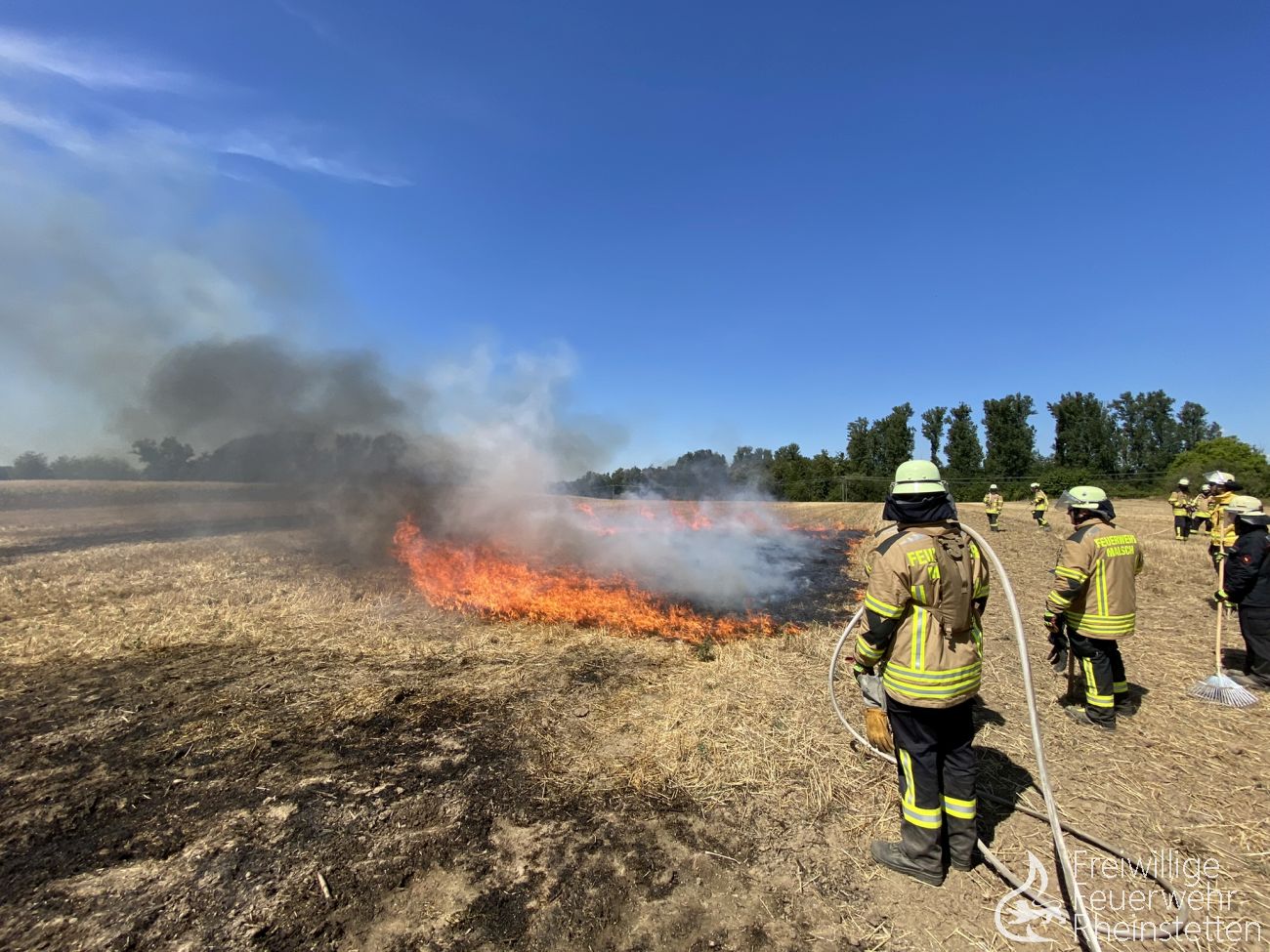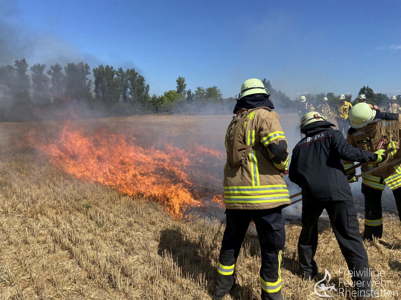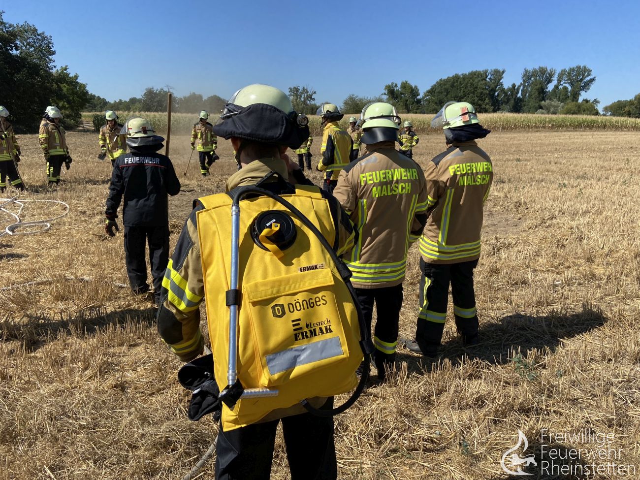 Auf dem Stoppelacker angekommen wurde als erstes das Schlagen von Brandschneisen und der Umgang mit den verschiedenen Handwerkzeugen geübt. Unter kontrollierten Bedingungen, mit mehreren Strahlrohren zur Absicherung und unter Anweisung eines erfahrenen externen Ausbilders konnte dann der erste kleine Abschnitt des Ackers angezündet und das Verhalten des Feuers auf der Fläche beobachtet werden. Nachdem die Teilnehmerinnen und Teilnehmer sich immer vertrauter mit den Handwerkzeugen gemacht hatten, wurden auch die entzündeten Flächen größer gewählt. Bei hochsommerlichen Temperaturen jenseits der 30 Grad, konnten auch Vorkommnisse wie plötzlich drehender Wind oder sogenannte „Spotfeuer“ beobachtet werden. Ebenfalls boten die Übungen die Möglichkeit die neu beschafften Löschrucksäcke der Feuerwehr Rheinstetten ausgiebig unter realen Bedingungen zu testen.