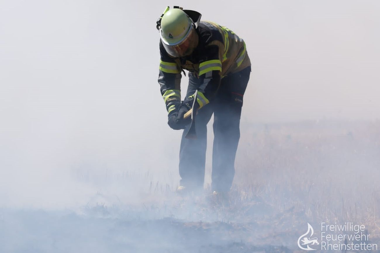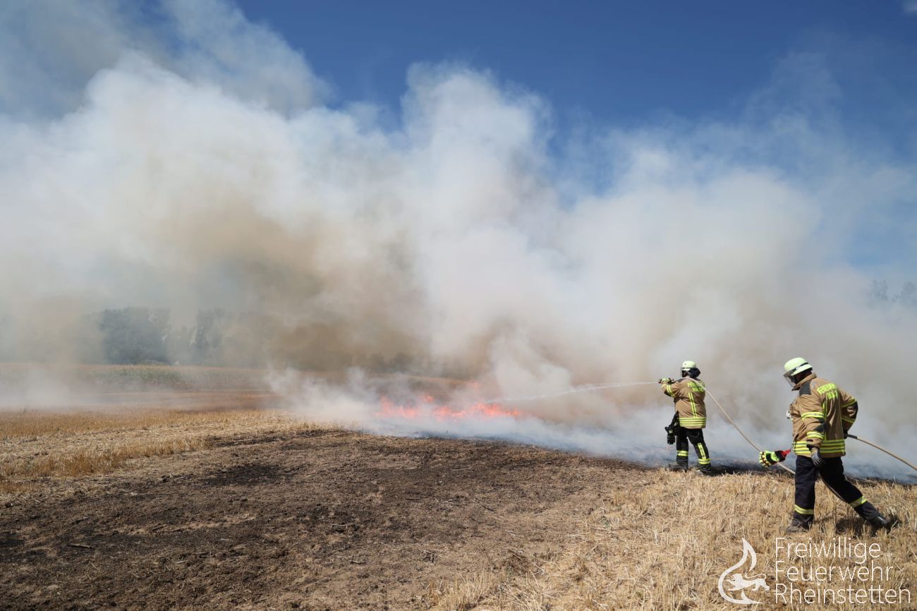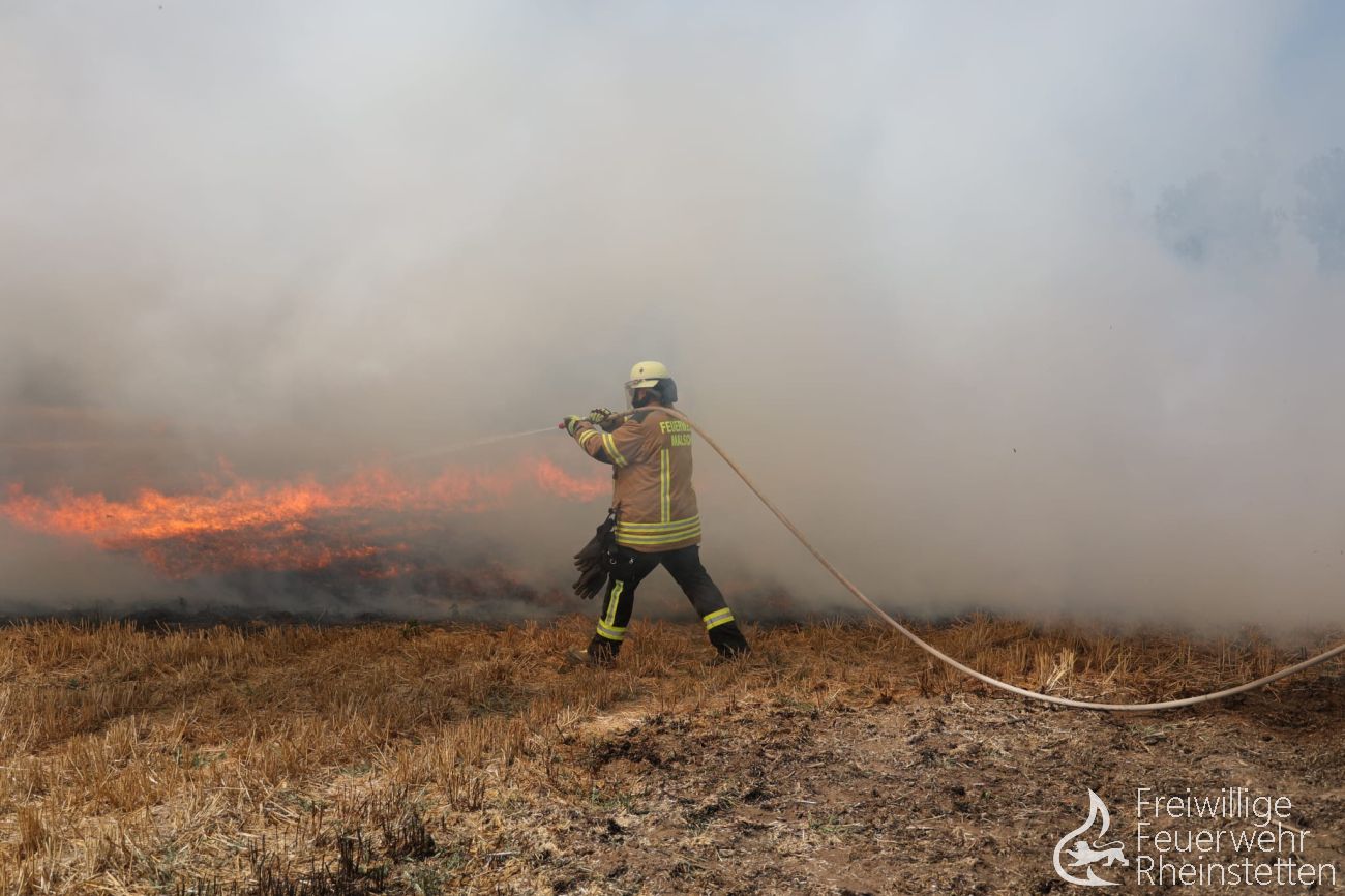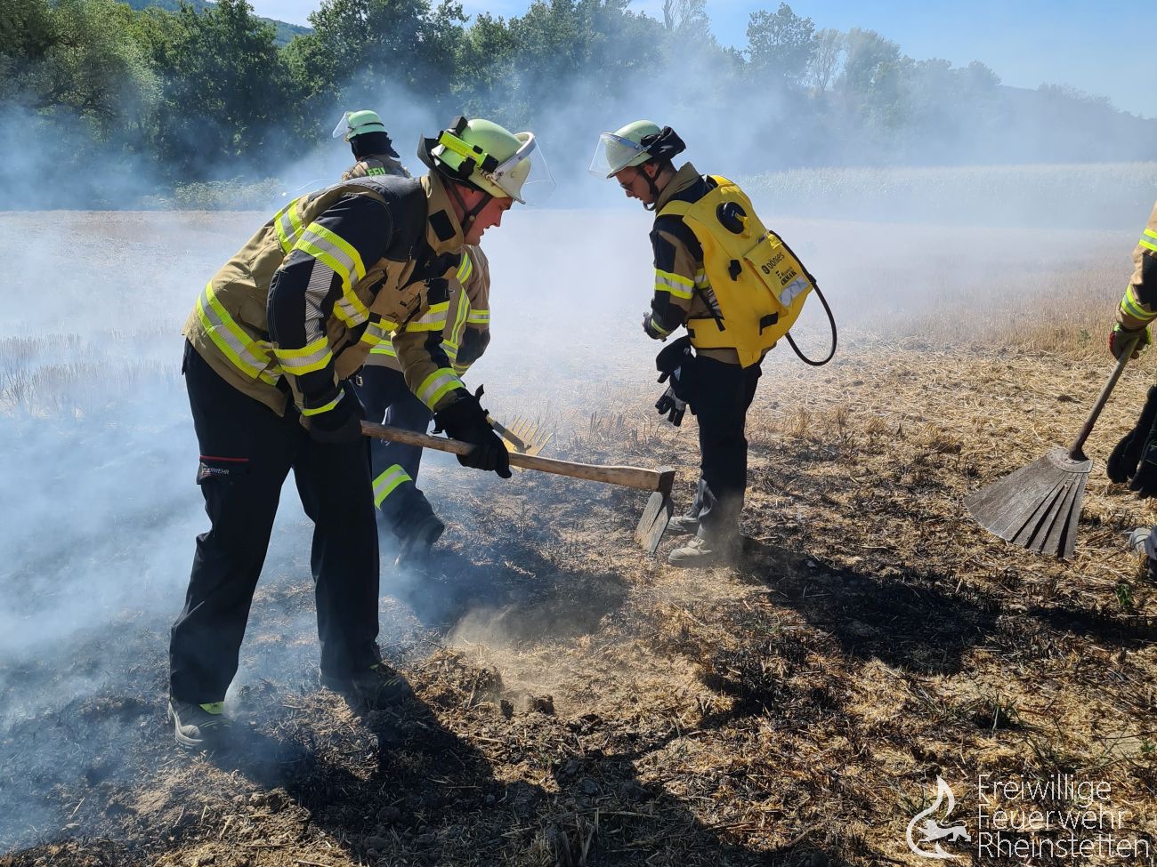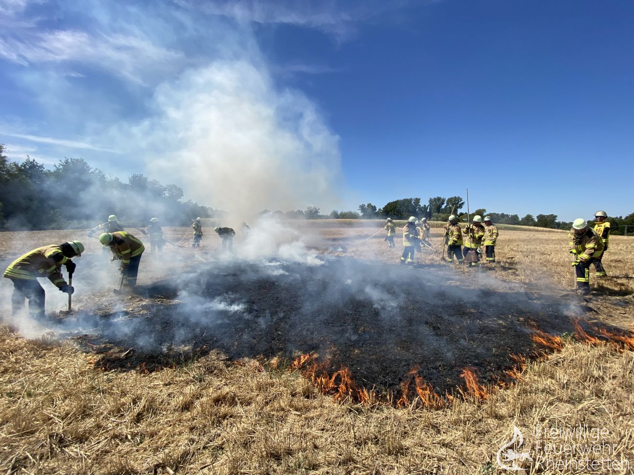 Auf dem Stoppelacker angekommen wurde als erstes das Schlagen von Brandschneisen und der Umgang mit den verschiedenen Handwerkzeugen geübt. Unter kontrollierten Bedingungen, mit mehreren Strahlrohren zur Absicherung und unter Anweisung eines erfahrenen externen Ausbilders konnte dann der erste kleine Abschnitt des Ackers angezündet und das Verhalten des Feuers auf der Fläche beobachtet werden. Nachdem die Teilnehmerinnen und Teilnehmer sich immer vertrauter mit den Handwerkzeugen gemacht hatten, wurden auch die entzündeten Flächen größer gewählt. Bei hochsommerlichen Temperaturen jenseits der 30 Grad, konnten auch Vorkommnisse wie plötzlich drehender Wind oder sogenannte „Spotfeuer“ beobachtet werden. Ebenfalls boten die Übungen die Möglichkeit die neu beschafften Löschrucksäcke der Feuerwehr Rheinstetten ausgiebig unter realen Bedingungen zu testen.