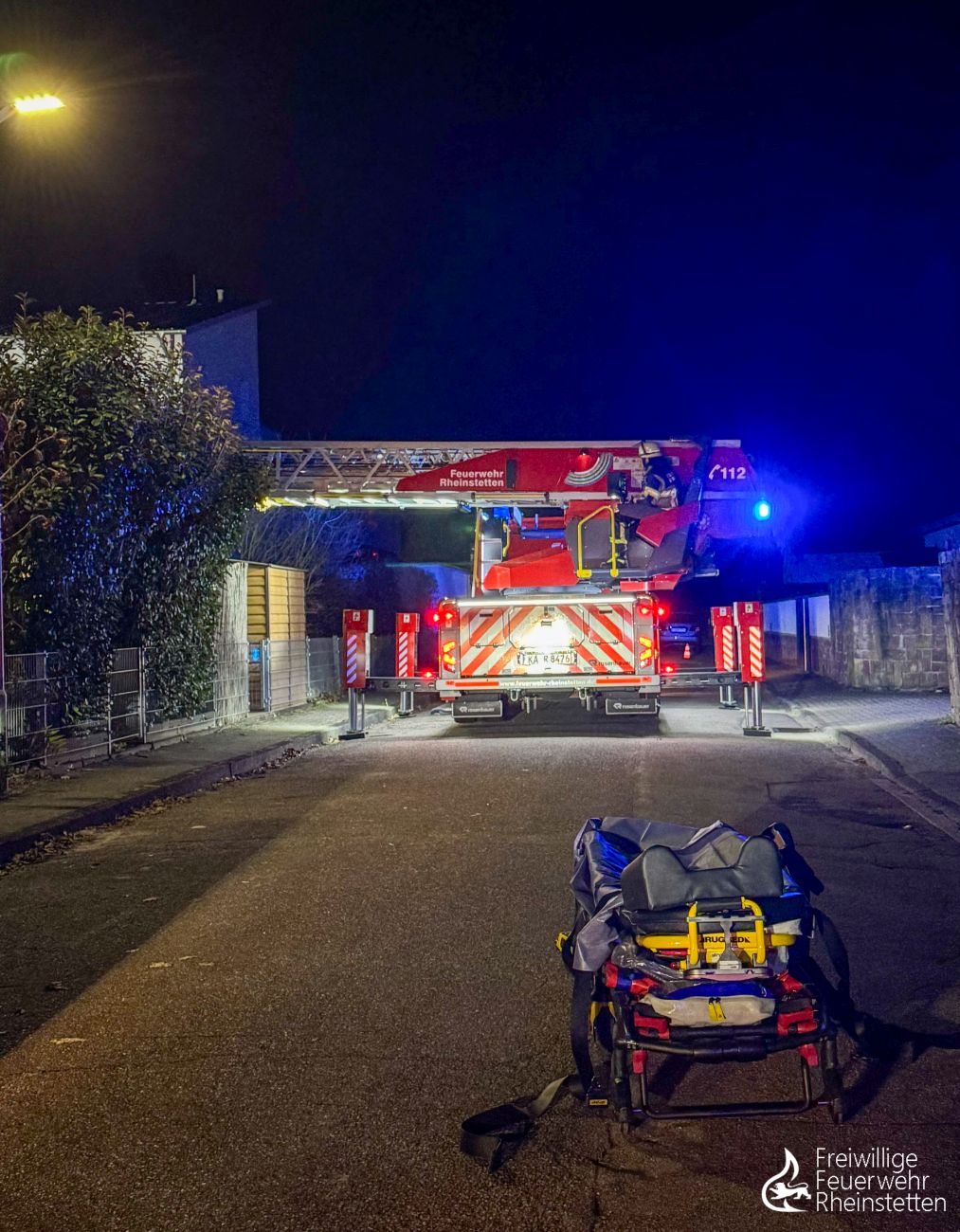 Am späten Donnerstagabend um 23:23 Uhr wurde die Abteilung Rheinstetten zu einer Einsatzstelle des Rettungsdienstes in den Stadtteil Silberstreifen alarmiert. Der Rettungsdienst hatte die Feuerwehr nachgefordert, da ein Patient aufgrund des Gesundheitszustandes und der räumlichen Situation mittels Drehleiter aus dem ersten Obergeschoss eines Reihenhauses nach unten transportiert werden musste.