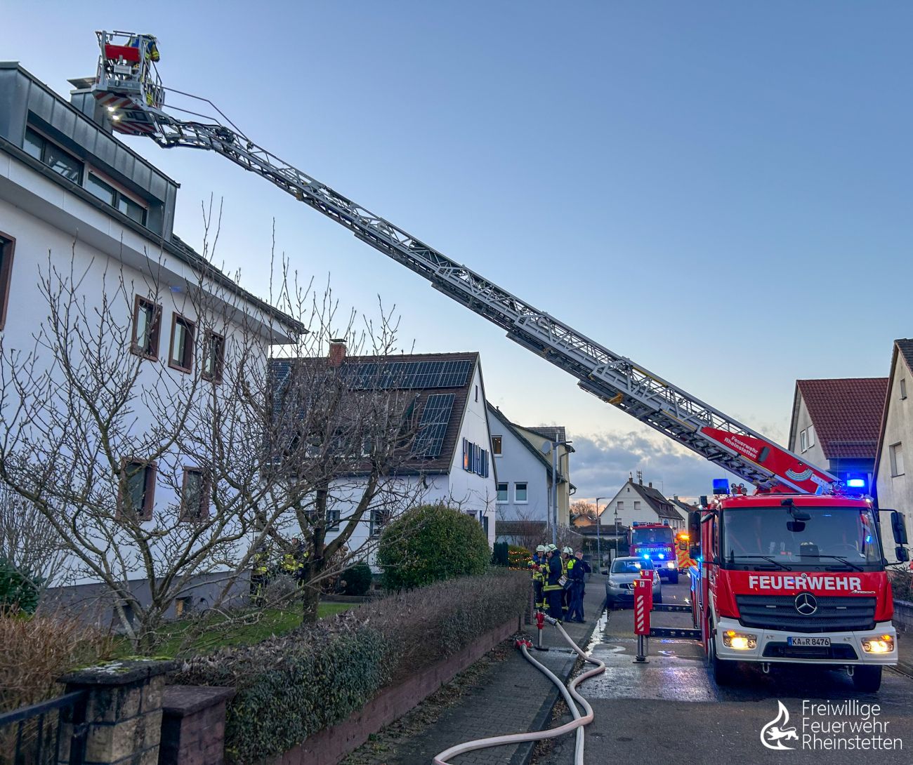 Beide Abteilungen wurden am Freitagnachmittag gegen 16:30 Uhr zu einem gemeldeten Kaminbrand in den Stadtteil Mörsch alarmiert. An einem Kamin waren augenscheinlich Flammen und Rauch sichtbar, was die Einsatzkräfte auf den Plan rief. Beim Eintreffen vor Ort waren allerdings weder Rauch noch Feuer ersichtlich, jedoch hatten die Anwohner ein Video der Situation gemacht. Es stellte sich heraus, dass der Sonnenuntergang, der sich in den Blechen des Kamins gespiegelt hatte, und der Rauch, der von der Heizungsanlage kam, gemeinsam den Eindruck eines täuschend echt wirkenden Kaminbrandes erweckt hatten. Sicherheitshalber wurde die Drehleiter dennoch in Stellung gebracht und der Kamin mittels Spiegel und Wärmebildkamera kontrolliert. Die Feuerwehr musste nicht weiter tätig werden und konnte den Einsatz beenden. Die Feuerwehr Rheinstetten war mit vier Fahrzeugen vor Ort. Ebenfalls vor Ort waren ein Rettungswagen und zwei Streifenwagen.