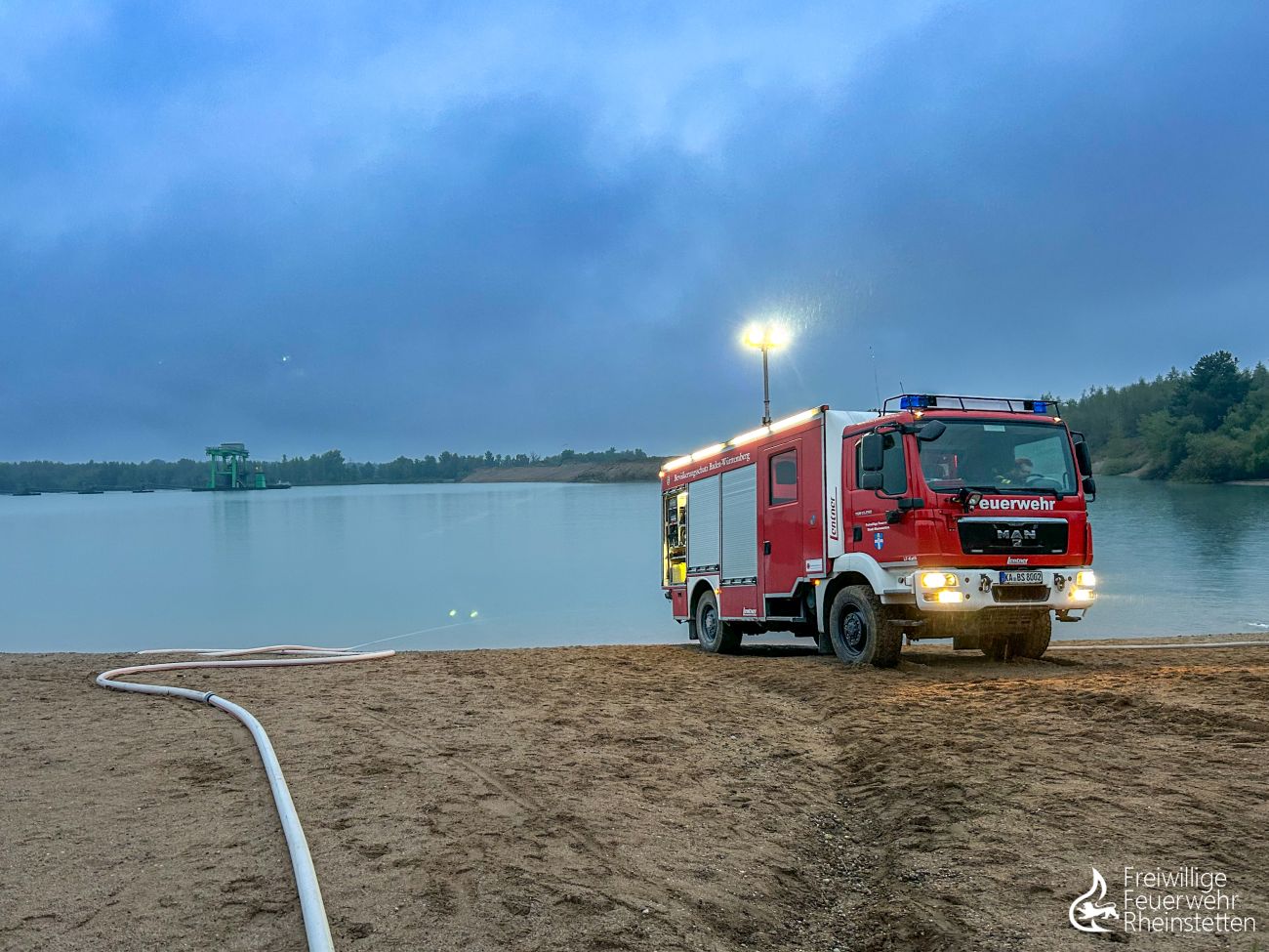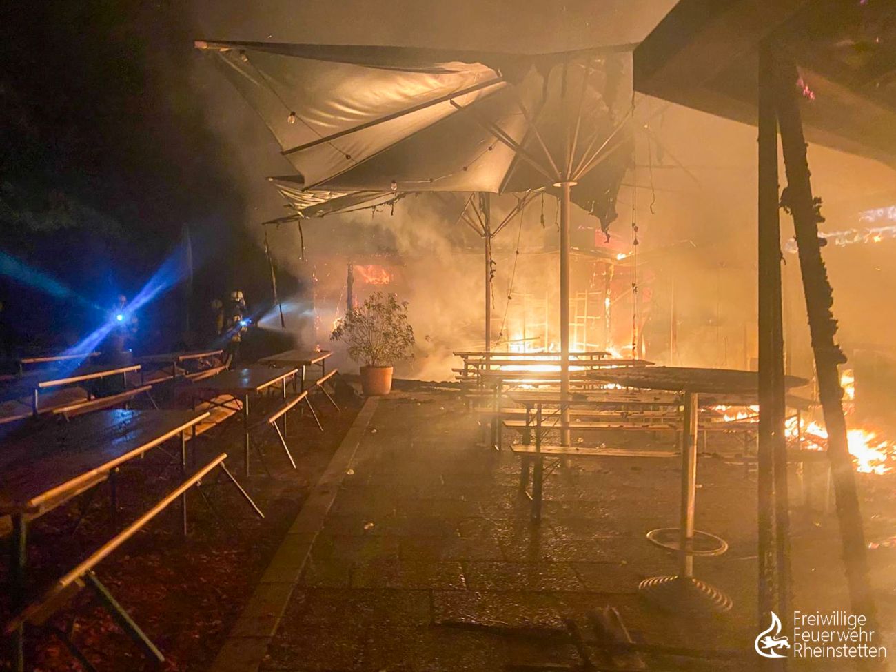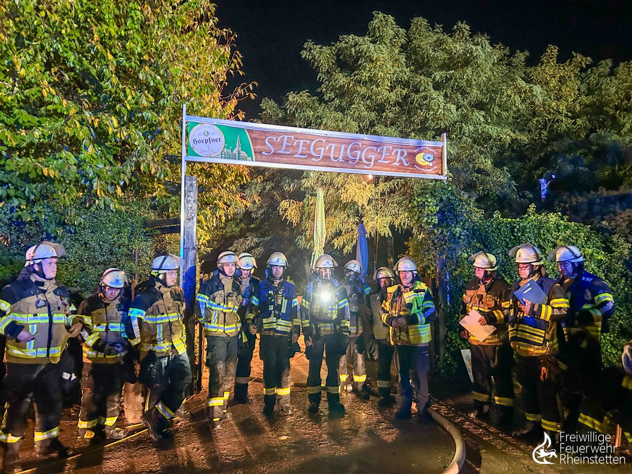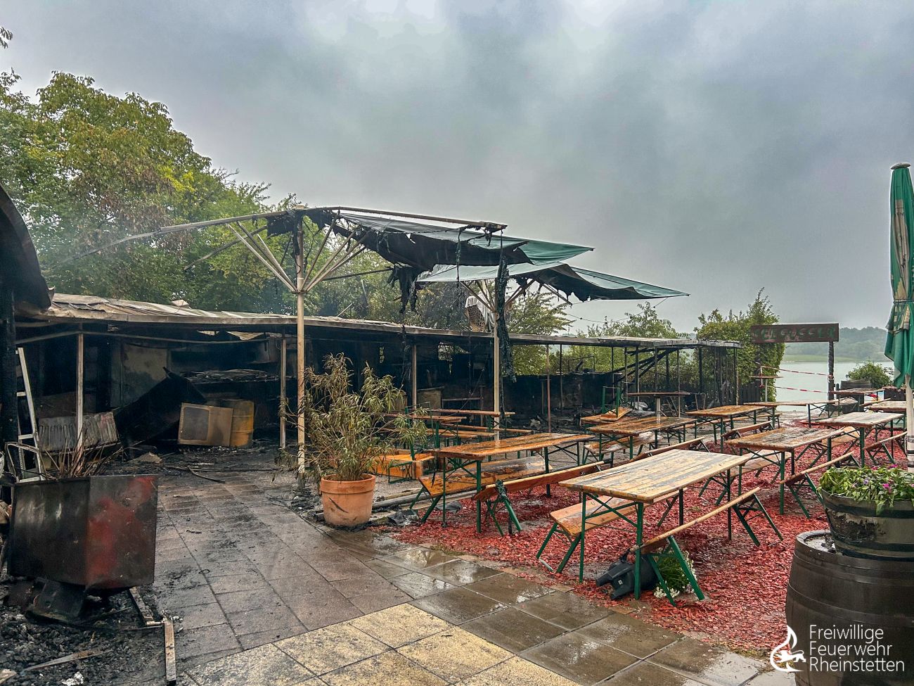 Am frühen Donnerstagmorgen um 2:10 Uhr wurde zunächst die zuständige Alarmgruppe der Abteilung Rheinstetten zu einer unklaren Feuer- und Rauchentwicklung im Freien aus dem Bereich der „Neuen Stadtmitte“ alarmiert, nachdem eine aufmerksame Passantin Feuerschein im Bereich eines nahen Waldstückes bemerkt hatte. Der ersteintreffende Kommandowagen konnte den starken Feuerschein bestätigen und ihn im Bereich des „Seeguggers“ am Epplesee eingrenzen, woraufhin die Alarmstufe erhöht wurde und beide Abteilungen der Feuerwehr Rheinstetten alarmiert wurden. Kurze Zeit später konnte die Lagemeldung gegeben werden, dass die bekannte Strand-Gaststätte in voller Ausdehnung brannte.