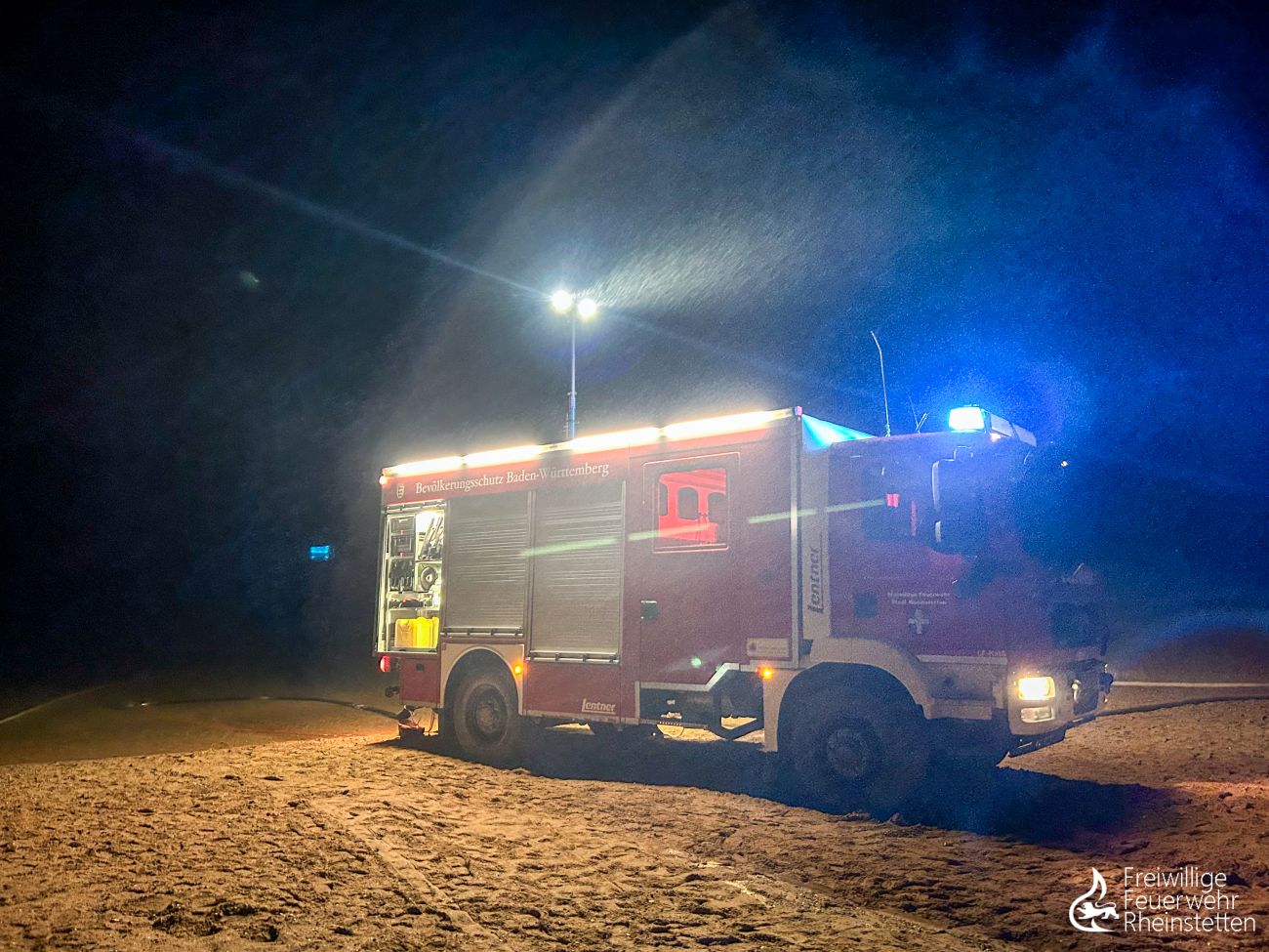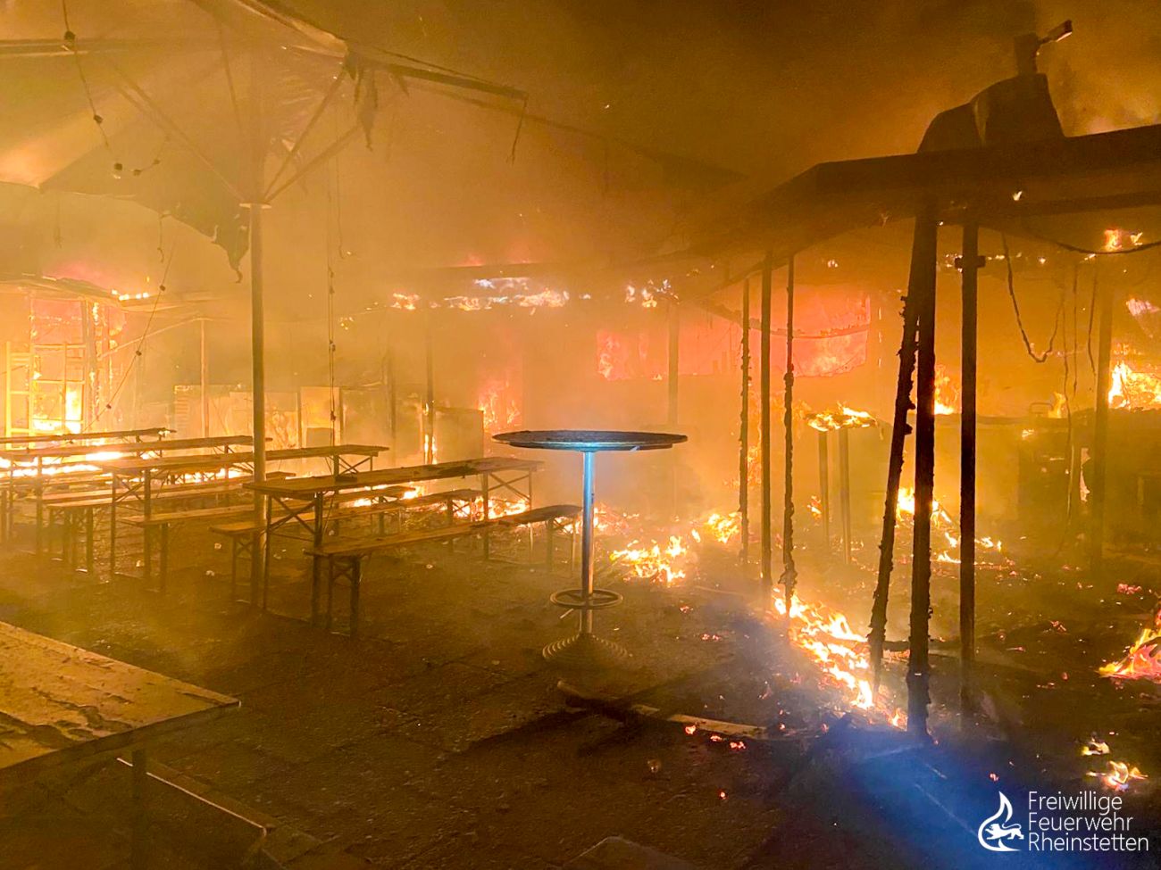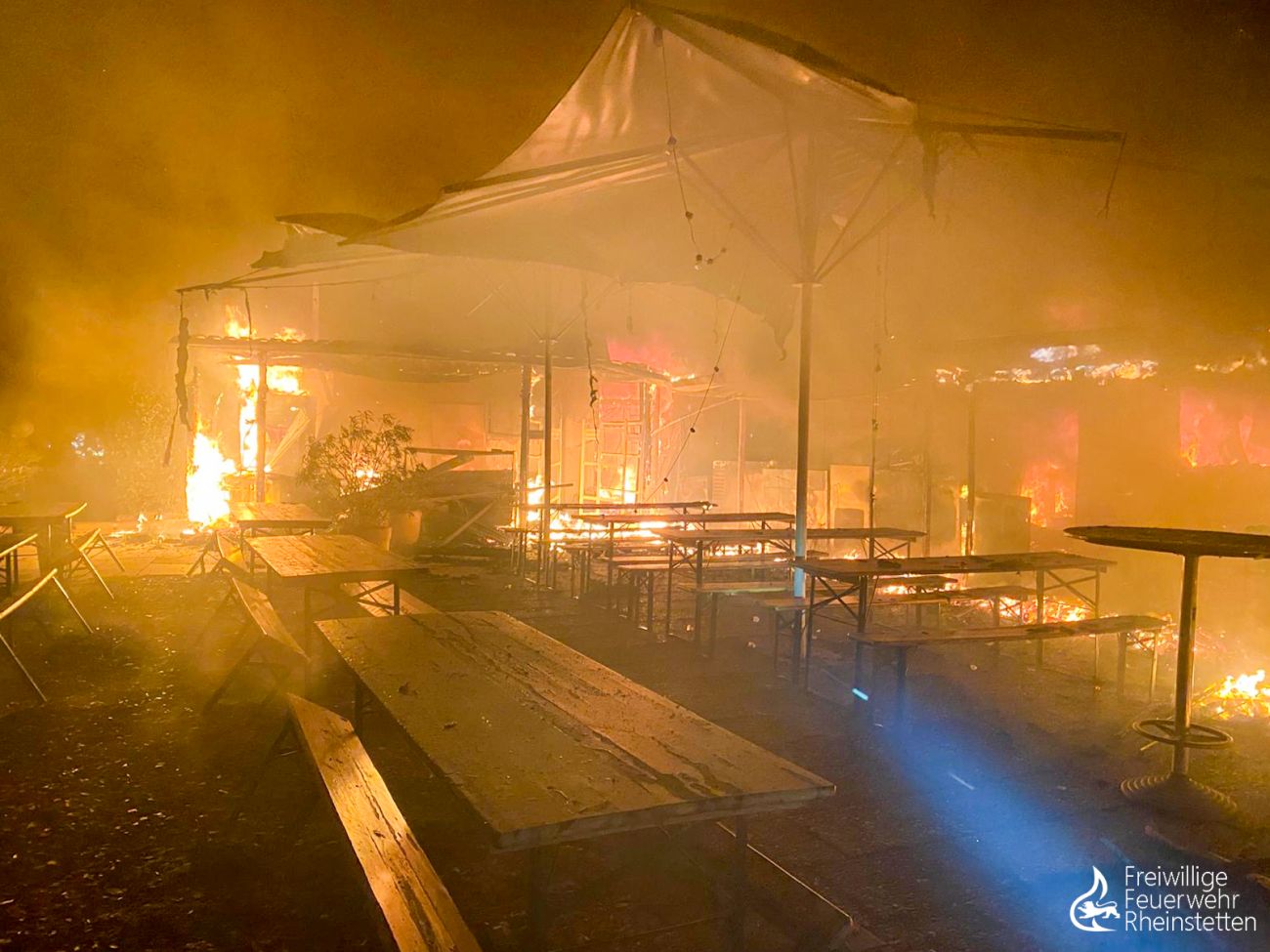 Am frühen Donnerstagmorgen um 2:10 Uhr wurde zunächst die zuständige Alarmgruppe der Abteilung Rheinstetten zu einer unklaren Feuer- und Rauchentwicklung im Freien aus dem Bereich der „Neuen Stadtmitte“ alarmiert, nachdem eine aufmerksame Passantin Feuerschein im Bereich eines nahen Waldstückes bemerkt hatte. Der ersteintreffende Kommandowagen konnte den starken Feuerschein bestätigen und ihn im Bereich des „Seeguggers“ am Epplesee eingrenzen, woraufhin die Alarmstufe erhöht wurde und beide Abteilungen der Feuerwehr Rheinstetten alarmiert wurden. Kurze Zeit später konnte die Lagemeldung gegeben werden, dass die bekannte Strand-Gaststätte in voller Ausdehnung brannte.
