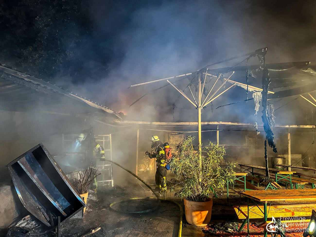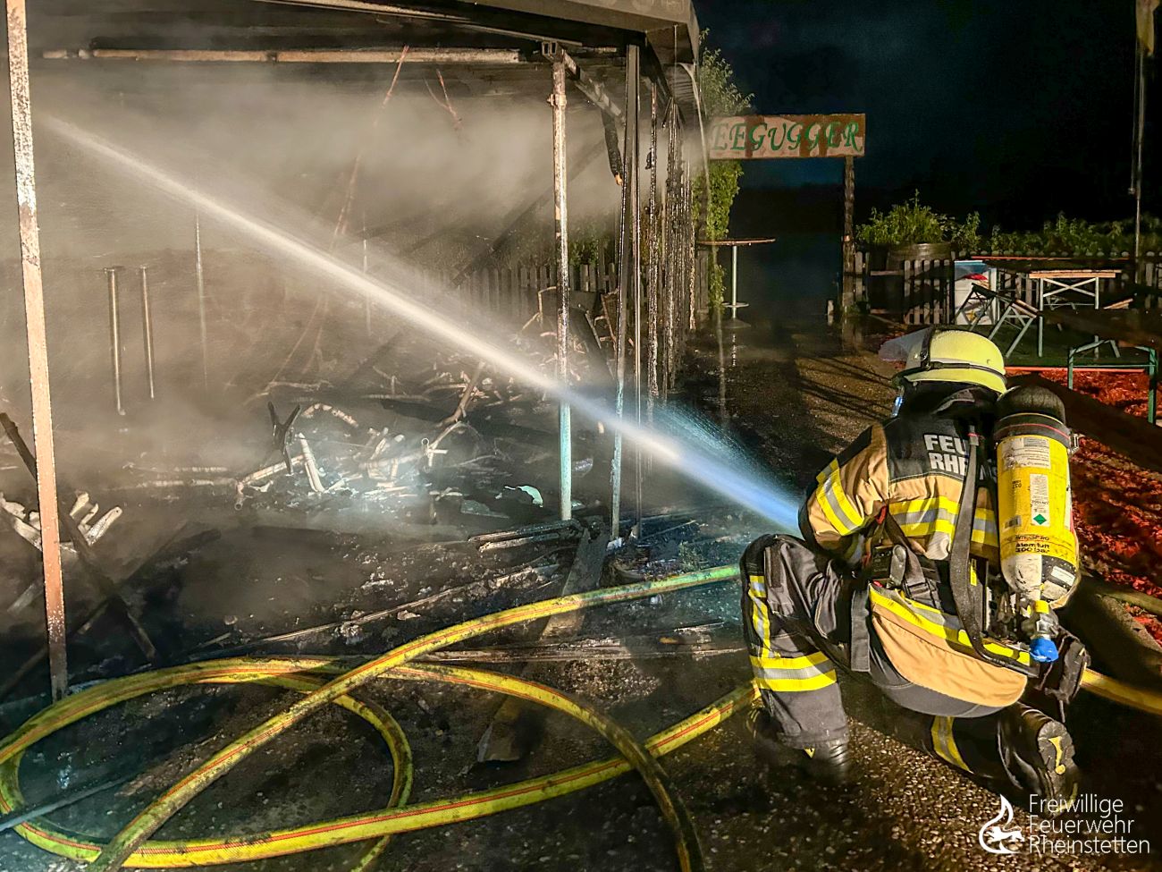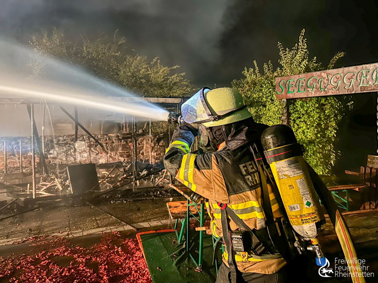 Unverzüglich wurde mit mehreren Trupps unter Atemschutz und mehreren Rohren ein Löschangriff eingeleitet. Trotz mehrerer wasserführender Fahrzeuge stellte sich die Löschwasserversorgung an der direkt am See gelegenen Gaststätte in der Anfangsphase als problematisch dar, weshalb Löschwasser direkt vom etwa 150 Meter entfernten Seeufer mittels zweier Pumpen entnommen und mit zwei Schlauchleitungen zu den Fahrzeugen transportiert werden musste. Aufgrund von Einsturzgefahr der vorhandenen Überdachung musste der Löschangriff größtenteils von außen erfolgen. Mit vier Rohren zeitgleich wurden die Flammen unter Atemschutz bekämpft, bevor um 3:54 Uhr „Feuer aus“ gemeldet werden konnte. Gegen 5:30 Uhr konnten dann die ersten Einsatzkräfte und Fahrzeuge aus dem Einsatz herausgelöst werden. Die umfangreichen Nachlöscharbeiten, für welche unter anderem das Dach teilweise abgedeckt werden, zwei Überseecontainer aufwendig aufgebrochen und Glutnester gesucht werden mussten, zogen sich bis 8 Uhr. Anschließend galt es die Fahrzeuge, Ausrüstung und Geräte gründlich zu reinigen, die Einsatzuniformen zu waschen und die Einsatzbereitschaft wiederherzustellen. Die zahlreichen Arbeiten im zentralen Feuerwehrhaus zogen sich für die ehrenamtlichen Kräfte bis gegen 11 Uhr am Donnerstagmorgen. Gegen 11 Uhr wurde außerdem eine Brandnachschau durchgeführt, um möglicherweise wieder aufflammende Glutnester in den Trümmern zu finden.