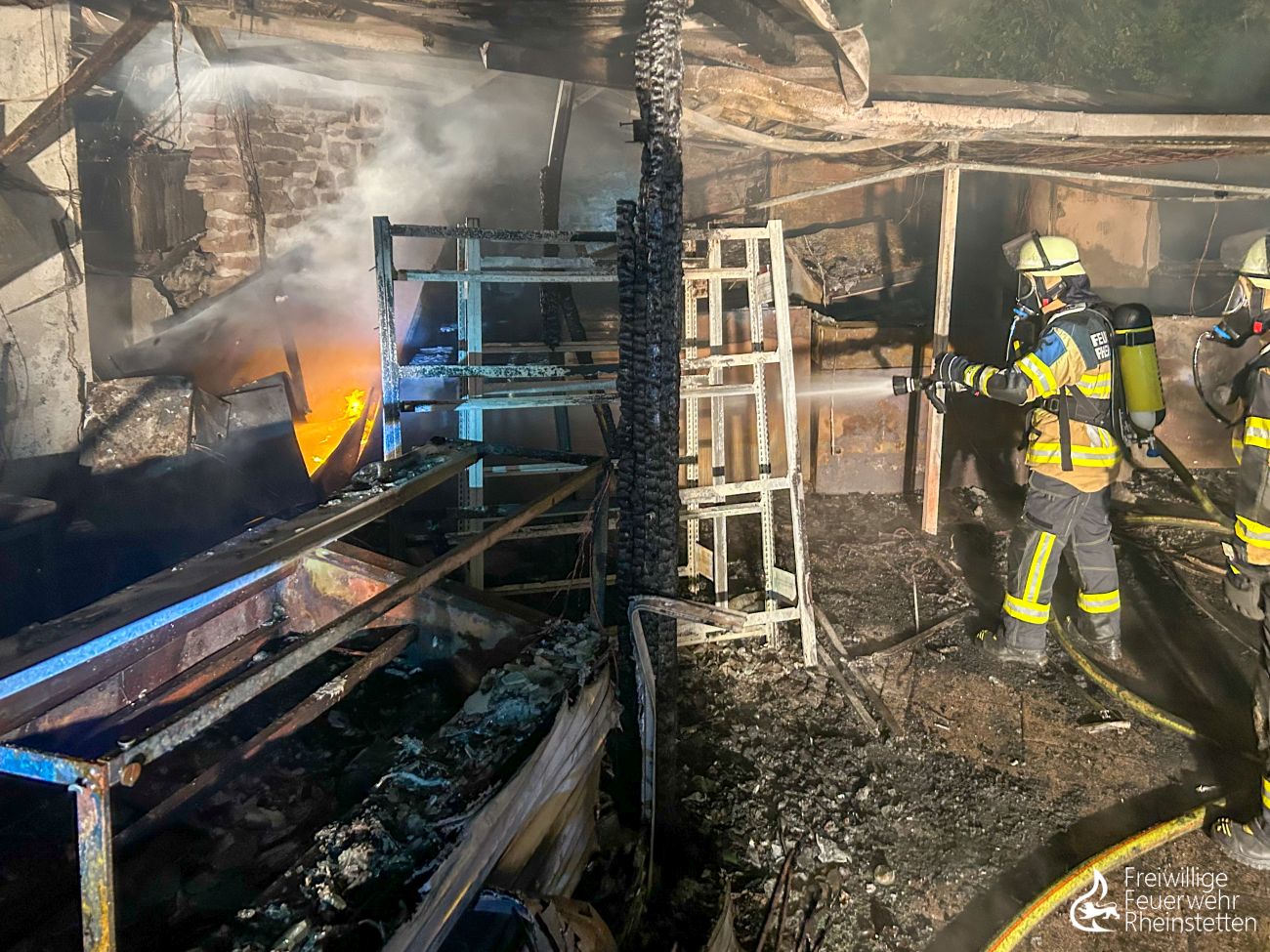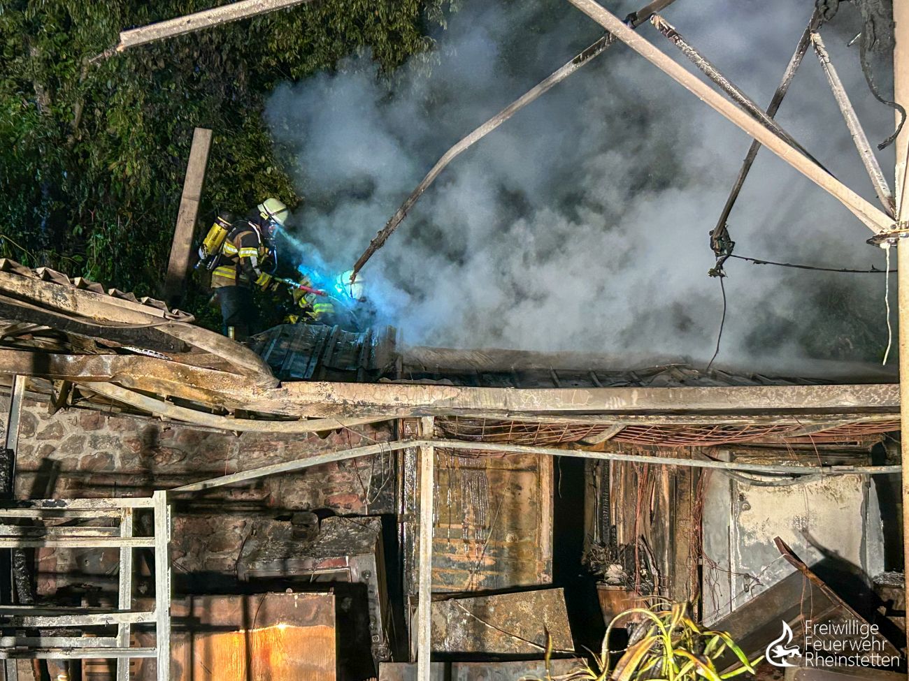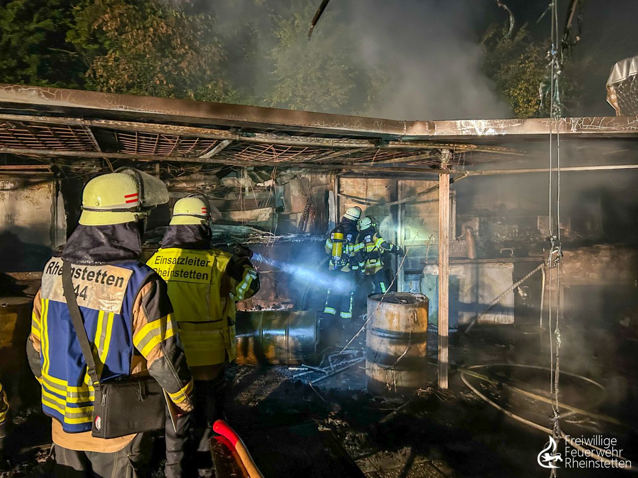 Unverzüglich wurde mit mehreren Trupps unter Atemschutz und mehreren Rohren ein Löschangriff eingeleitet. Trotz mehrerer wasserführender Fahrzeuge stellte sich die Löschwasserversorgung an der direkt am See gelegenen Gaststätte in der Anfangsphase als problematisch dar, weshalb Löschwasser direkt vom etwa 150 Meter entfernten Seeufer mittels zweier Pumpen entnommen und mit zwei Schlauchleitungen zu den Fahrzeugen transportiert werden musste. Aufgrund von Einsturzgefahr der vorhandenen Überdachung musste der Löschangriff größtenteils von außen erfolgen. Mit vier Rohren zeitgleich wurden die Flammen unter Atemschutz bekämpft, bevor um 3:54 Uhr „Feuer aus“ gemeldet werden konnte. Gegen 5:30 Uhr konnten dann die ersten Einsatzkräfte und Fahrzeuge aus dem Einsatz herausgelöst werden. Die umfangreichen Nachlöscharbeiten, für welche unter anderem das Dach teilweise abgedeckt werden, zwei Überseecontainer aufwendig aufgebrochen und Glutnester gesucht werden mussten, zogen sich bis 8 Uhr. Anschließend galt es die Fahrzeuge, Ausrüstung und Geräte gründlich zu reinigen, die Einsatzuniformen zu waschen und die Einsatzbereitschaft wiederherzustellen. Die zahlreichen Arbeiten im zentralen Feuerwehrhaus zogen sich für die ehrenamtlichen Kräfte bis gegen 11 Uhr am Donnerstagmorgen. Gegen 11 Uhr wurde außerdem eine Brandnachschau durchgeführt, um möglicherweise wieder aufflammende Glutnester in den Trümmern zu finden.