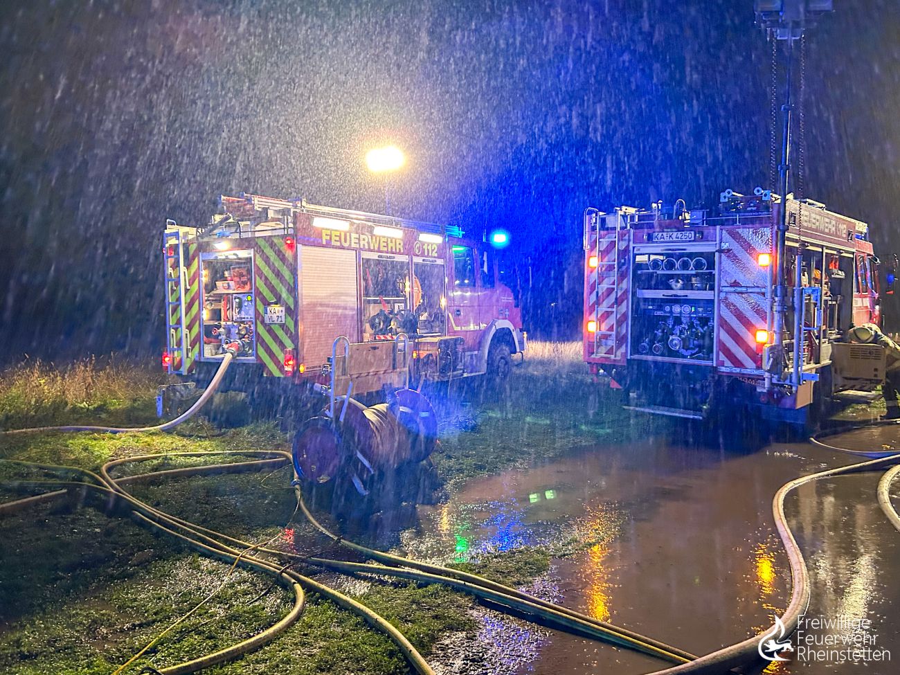 Neben der schwierigen Löschwasserversorgung stellte auch der bereits mehrtägig anhaltende Dauerregen die Einsatzkräfte vor Herausforderungen - die nicht befestigten schlammigen Zufahrtswege, durchnässte Einsatzkräfte, verschlammte Ausrüstung, die herbstliche Witterung, aber auch die lange Einsatzdauer.