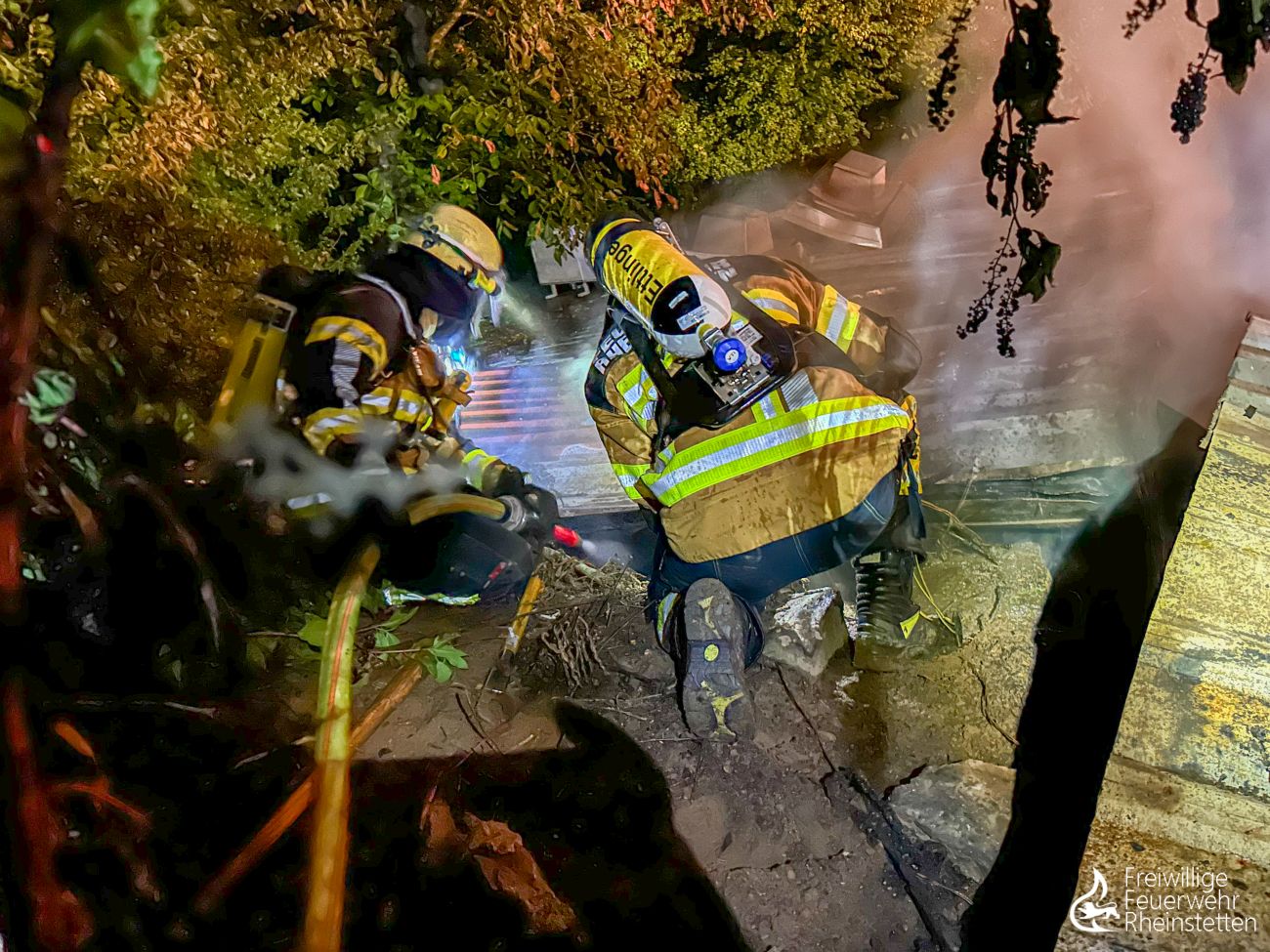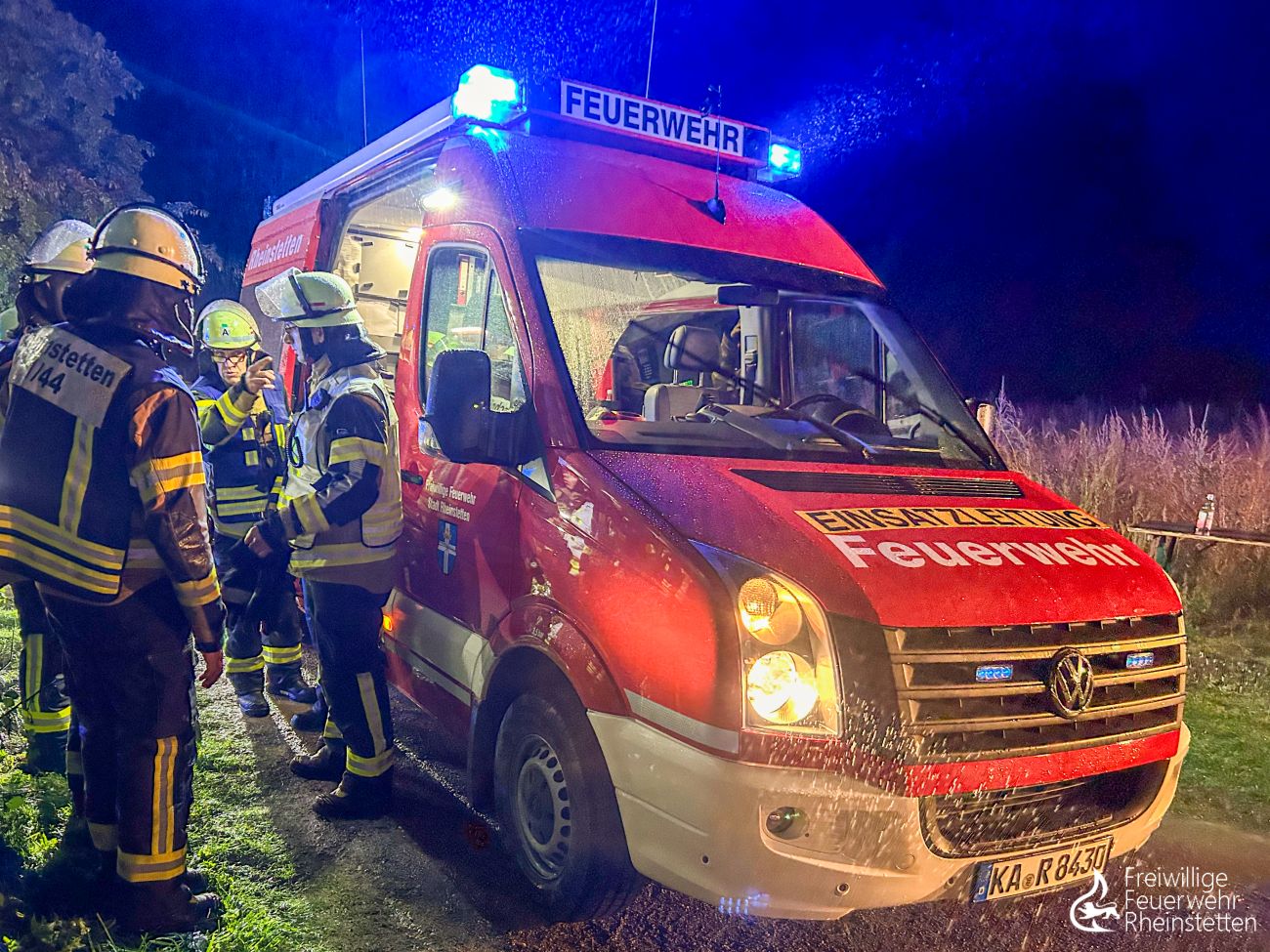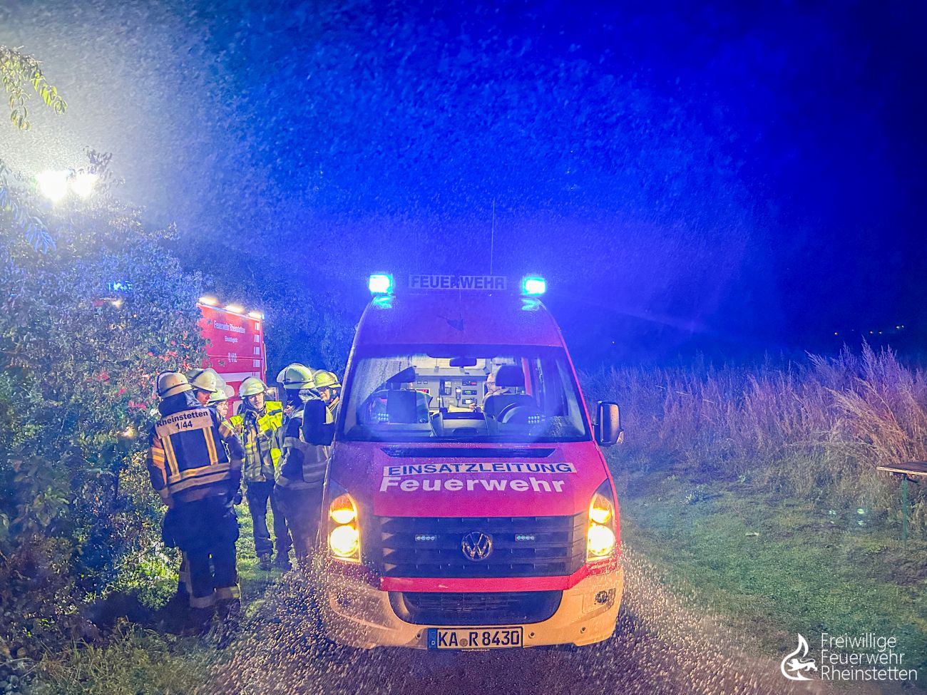 Die Feuerwehr Rheinstetten war mit 60 Einsatzkräften, zehn Fahrzeugen und der Hygienekomponente vor Ort. Die Hygienekomponente kommt übrigens immer dann zum Einsatz, wenn Einsatzkräfte durch Ruß und Brandgase kontaminiert sind, Ersatzkleidung benötigt wird und Material zur Reinigung ins zentrale Feuerwehrhaus verbracht werden muss. Ebenfalls vor Ort war die Feuerwehr Ettlingen mit zwei Fahrzeugen, um weitere Atemschutzgeräte zur Verfügung zu stellen. Der stellvertretende Kreisbrandmeister Dominik Wolf machte sich vor Ort ein Bild über die Einsatzlage. Zur Absicherung der Einsatzkräfte waren ein Rettungswagen,