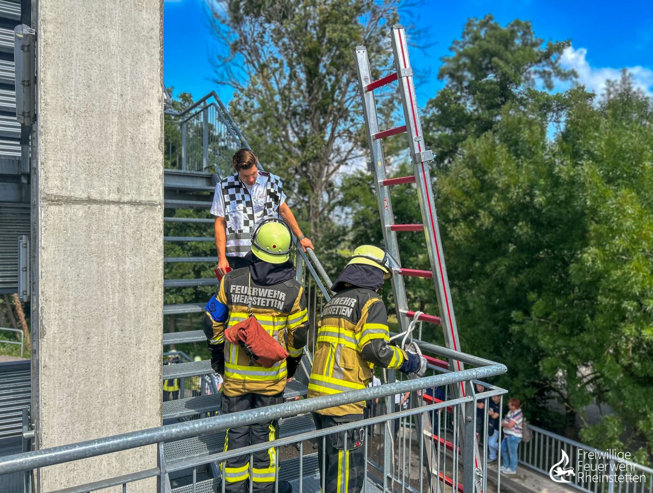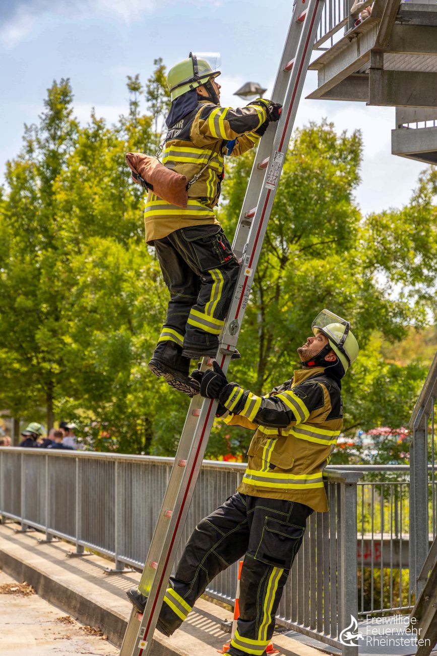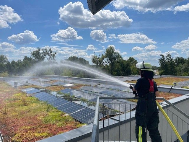So galt es, der Mannschaft Feuerwehrwissen von der Pike auf zu vermitteln: Rechtsgrundlagen und Paragraphen, Löschen und Retten, technische Hilfeleistung, Gefahrstoffe, Einsatztaktik und Logistik, persönliche Schutzausrüstung, Erste Hilfe und vieles mehr gehörten zum theoretischen Ausbildungsinhalt. Im praktischen Teil der Ausbildung lag dem Team der Ausbilder besonders die Vermittlung wichtiger Grundlagen am Herzen: einsatzrelevante Knoten, Zugang höhergelegener Etagen mittels Steckleiter, Personenrettung und der Löschangriff mit und ohne Bereitstellung wurden wieder und wieder trainiert, bis die notwendigen Handgriffe immer intuitiver und das abzurufende Wissen immer präsenter waren – und sei es bei sommerlichen 35 Grad Celsius Außentemperatur. Gekrönt wurde das Kapitel „Löschangriff“ von einer sogenannten Nassübung, in der ein Löschangriff unter realen Bedingungen und mit wasserführenden Schläuchen simuliert wurde.