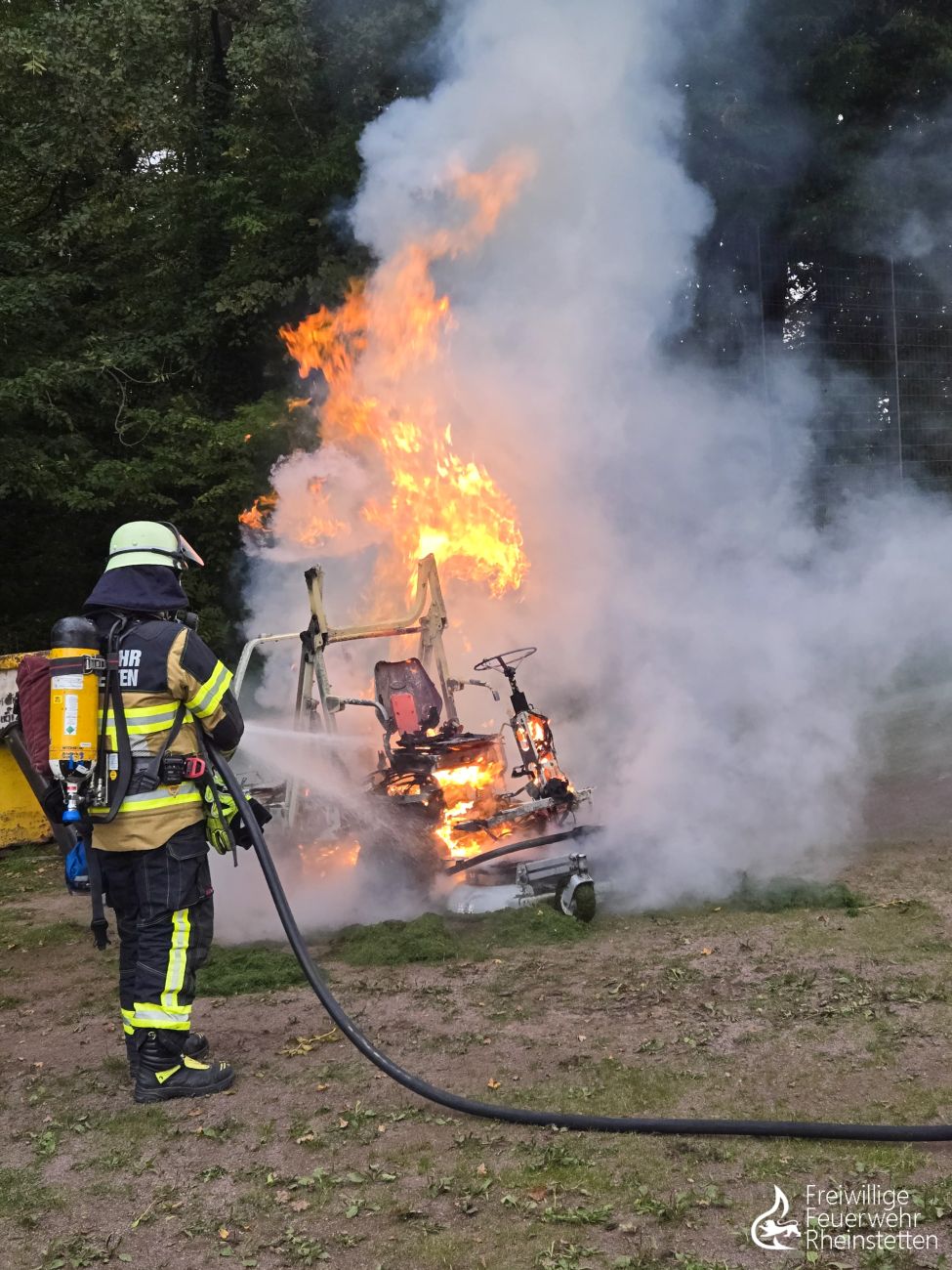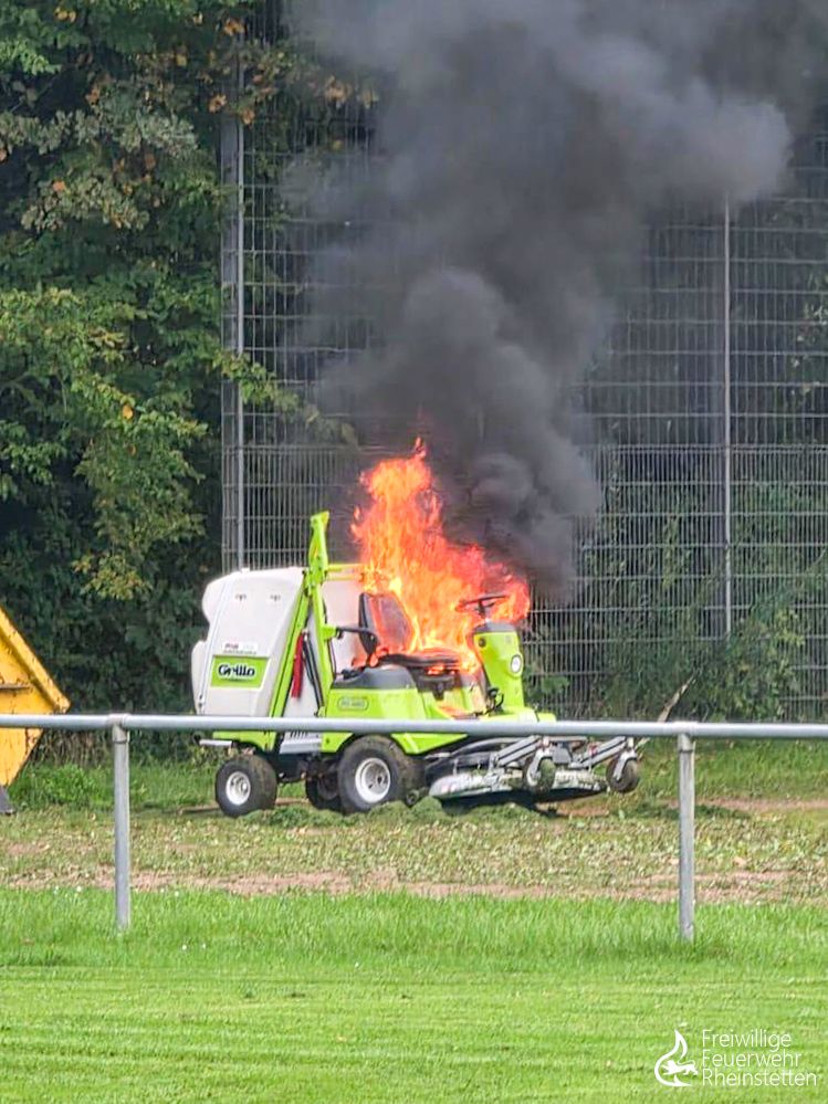 Am Freitagnachmittag um 17:40 Uhr wurden die Abteilung Neuburgweier und die zuständige Alarmgruppe der Abteilung Rheinstetten zu einem brennenden Aufsitzrasenmäher zwischen den Spielfeldern des SC Neuburgweier im Stadtteil Neuburgweier alarmiert. Beim Eintreffen der Feuerwehr stand der Rasenmäher in Vollbrand. Ein Trupp unter Atemschutz löschte das Feuer mit einem Rohr ab und führte Nachlöscharbeiten durch. Die Feuerwehr Rheinstetten war mit vier Fahrzeugen vor Ort.
