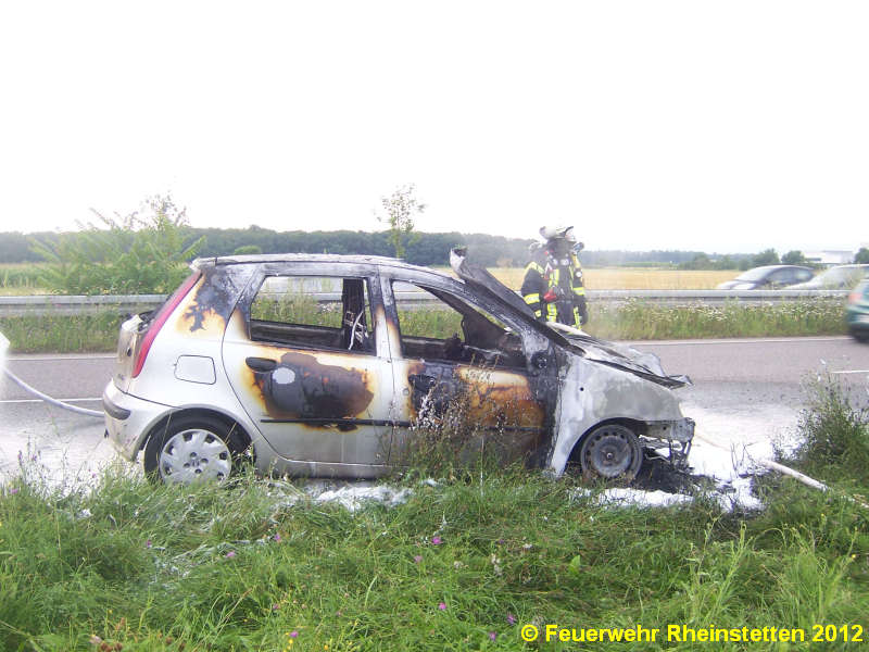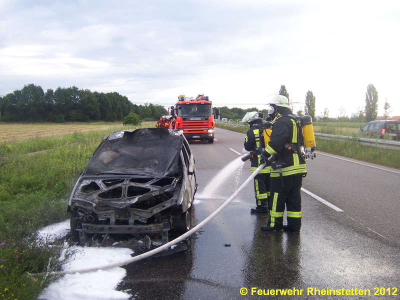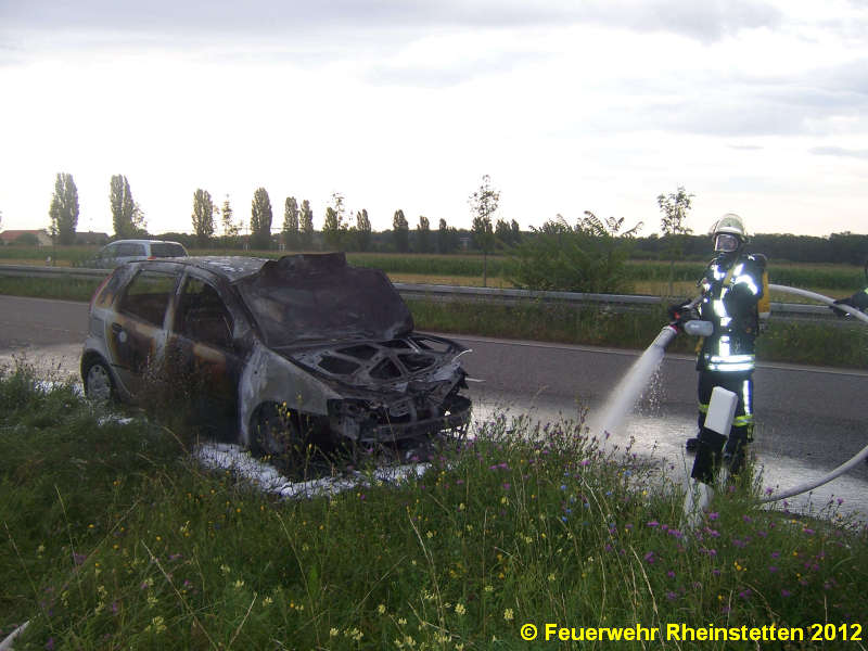 Weit sichtbar war eine kleinere Rauchsäule die ein brennender Kleinwagen am 30.07.2012 erzeugte und der zur Alarmierung der Rheinstettener Feuerwehr führte. Auf der Bundesstraße 36 aus Karlsruhe in Richtung Süd fahrend hatte der Pkw- Fahrer sein im Motorraum brennendes Fahrzeug auf der Bundesstraße abstellen müssen. Ein paar Habseligkeiten konnte er noch aus dem Fahrzeug mitnehmen, das mehr und mehr brannte. Glücklicherweise konnte er das Fahrzeug unverletzt verlassen und hinter der Leitplanke auf dem Fahrradweg auf die Feuerwehr warten. Nur vom giftigen Rauch wurde